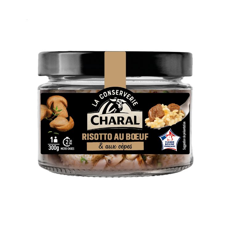Risotto cuit à base de 15 % de viande de bœuf, de 12 % de riz long étuvé de qualité supérieure aux brisures de cèpes goût champignon.