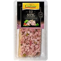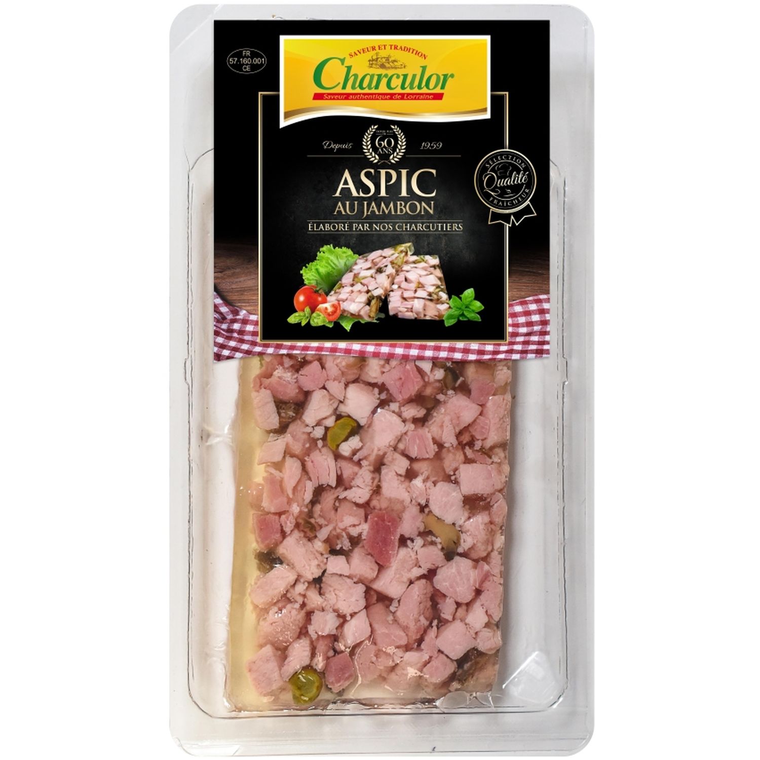 Jambon de porc traité en salaison 40% (jambon 30%, sel dextrose, LACTOSE, saccharose, sirop de glucose, extraits d'épices, stabilisant : polyphosphates. Arômes naturels, conservateurs : nitrite de sodium, ascorbate de sodium). Gelée (eau, gélatine bovine, vin blanc (SULFITE), cornichon (vinaigre d'alcool, conservateur : biSULFITE de sodium), champignon de Paris, sel, conservateur : lactate de sodium.Acidifiants : acide citrique, acide ascorbique. Exhausteur de goût : glutamate monosodique).