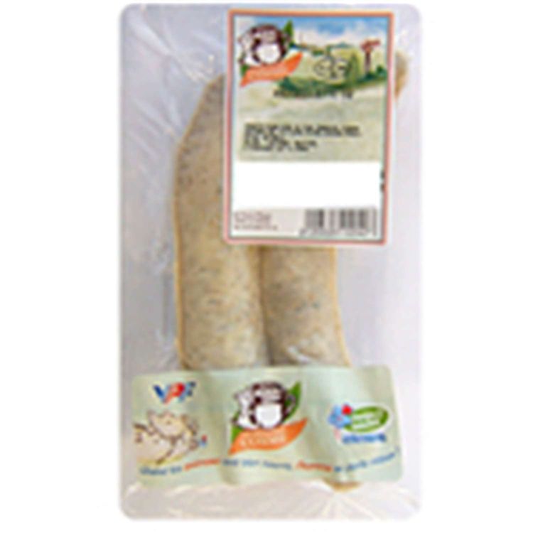 Chaudin, panse et jarret de porc français, oignon, MOUTARDE (eau, graines de MOUTARDE, vinaigre, sel, conservateur : BISULFITE de sodium, épices), vin blanc (SULFITES), sel, poivre, persil, noix de muscade moulue, boyau naturel de porc.