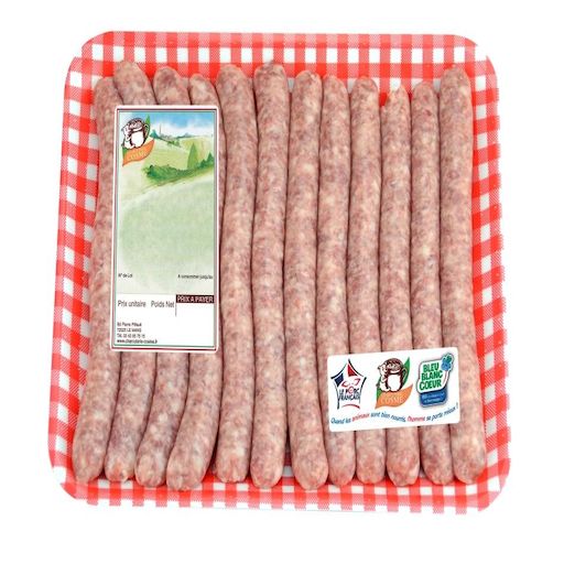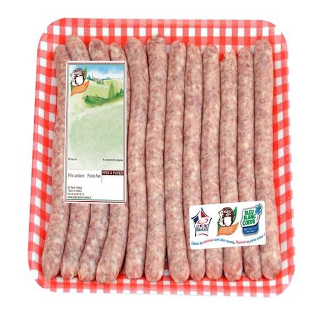 "Viande de porc français (97%), sel de Guérande, sel, acétate de sodium, antioxydant : ascorbate de sodium ; dextrose, poivre, boyau naturel de mouton."
