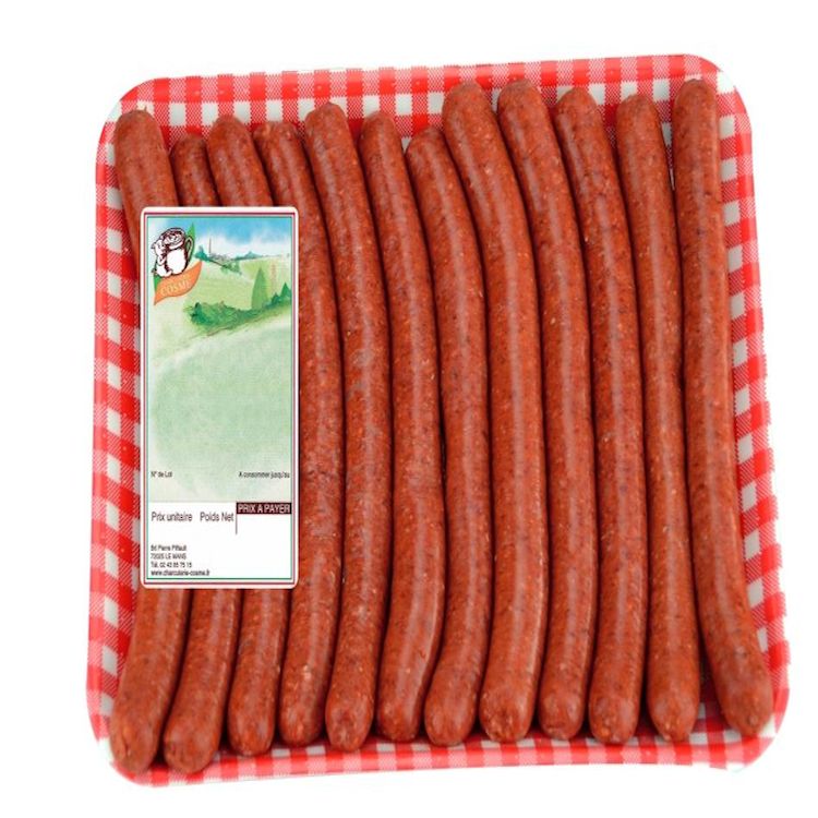 Viande de bœuf français (62%) et viande de mouton français (31%), dextrose, épices et plantes aromatiques, sel, arômes naturels, colorants : rouge de betterave et carmins ; antioxydants : ascorbate de sodium, acide ascorbique ; sel de Guérande, boyau naturel de mouton.
