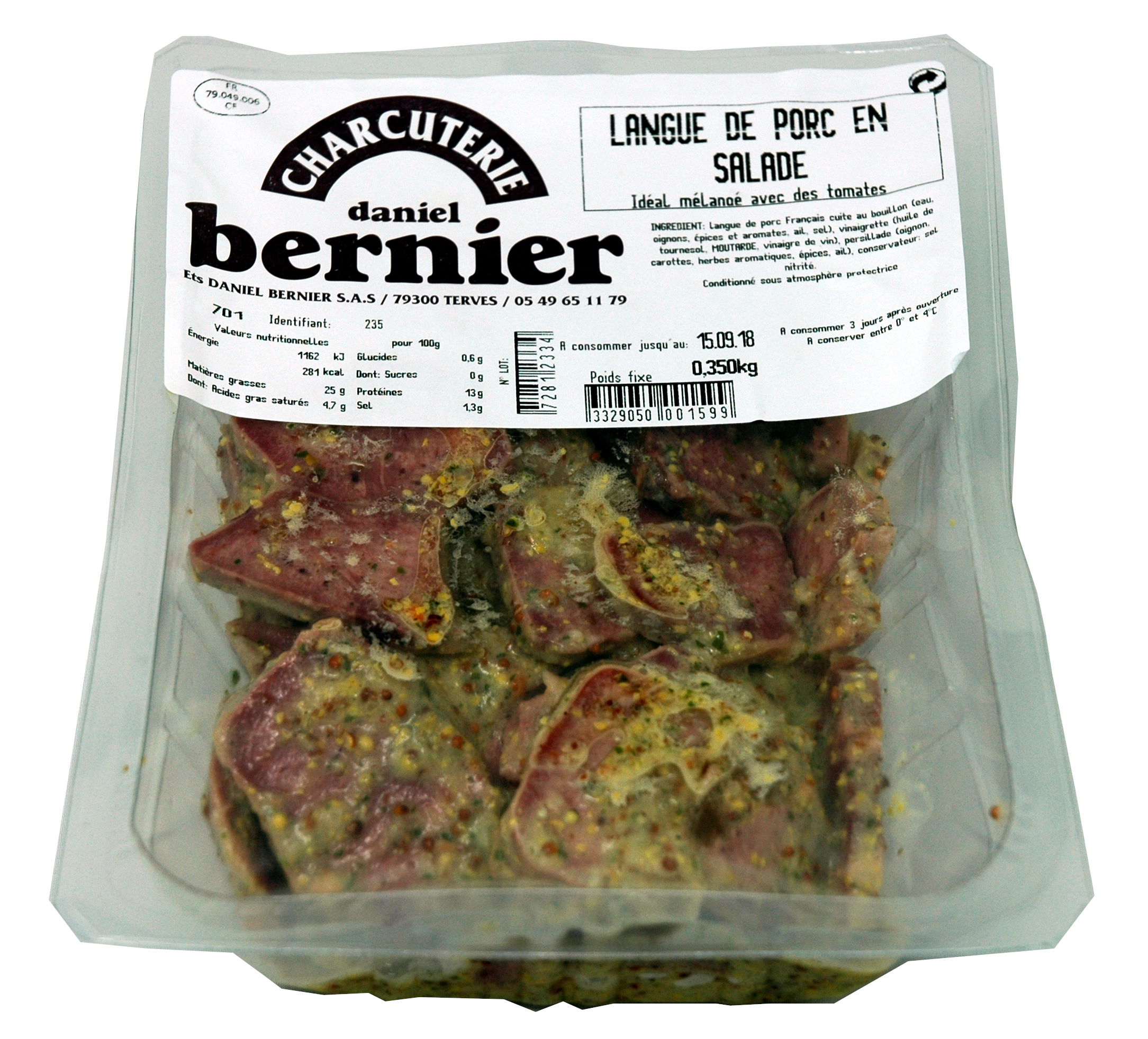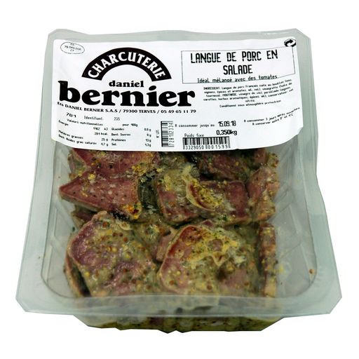 Langue de porc Français cuite au bouillon (eau, oignon, épices, aromates, ail, sel), vinaigrette (huile de tournesol, MOUTARDE, vinaigre de vin), persillade (oignon, carottes, herbes aromatiques, épice, ail), conservateur : E250