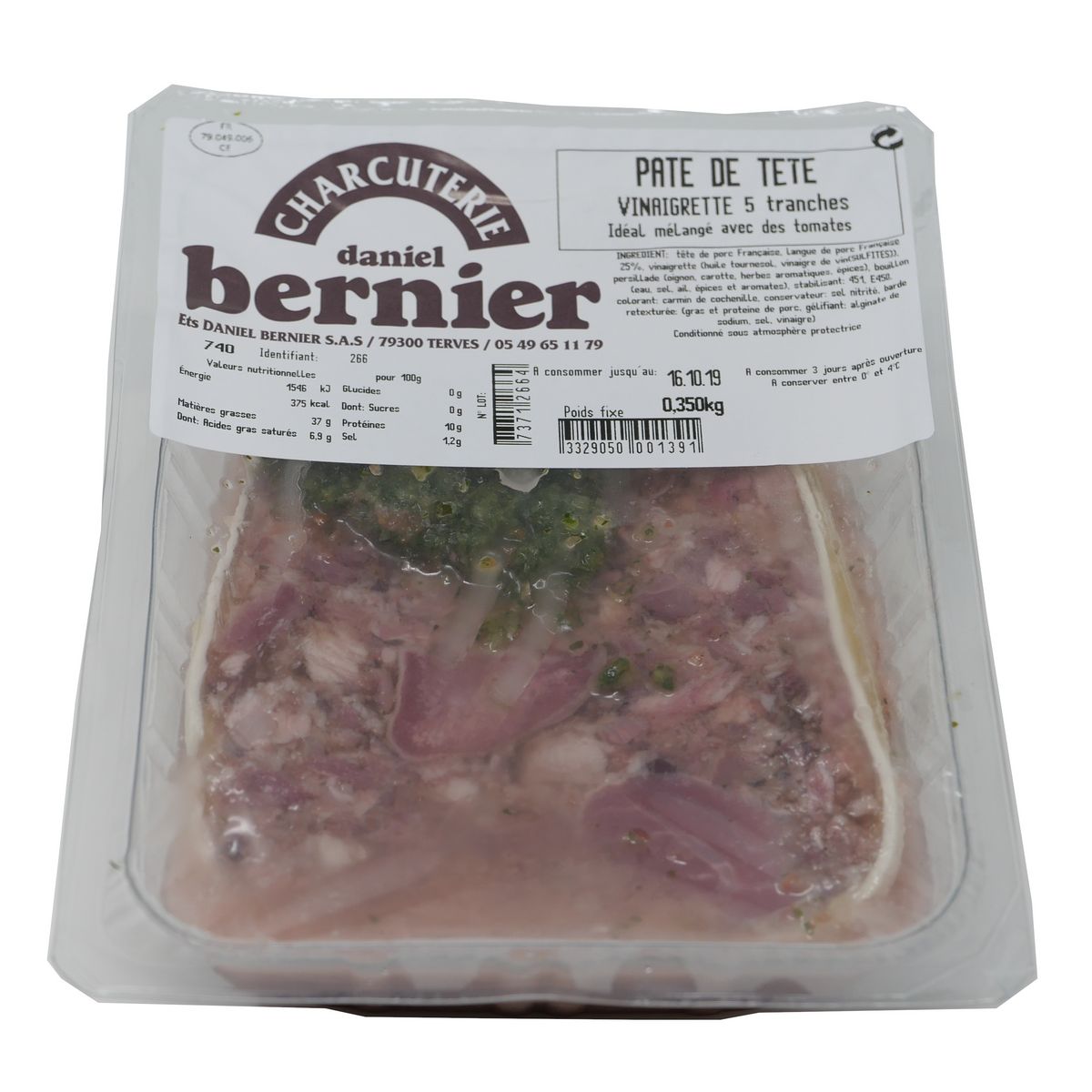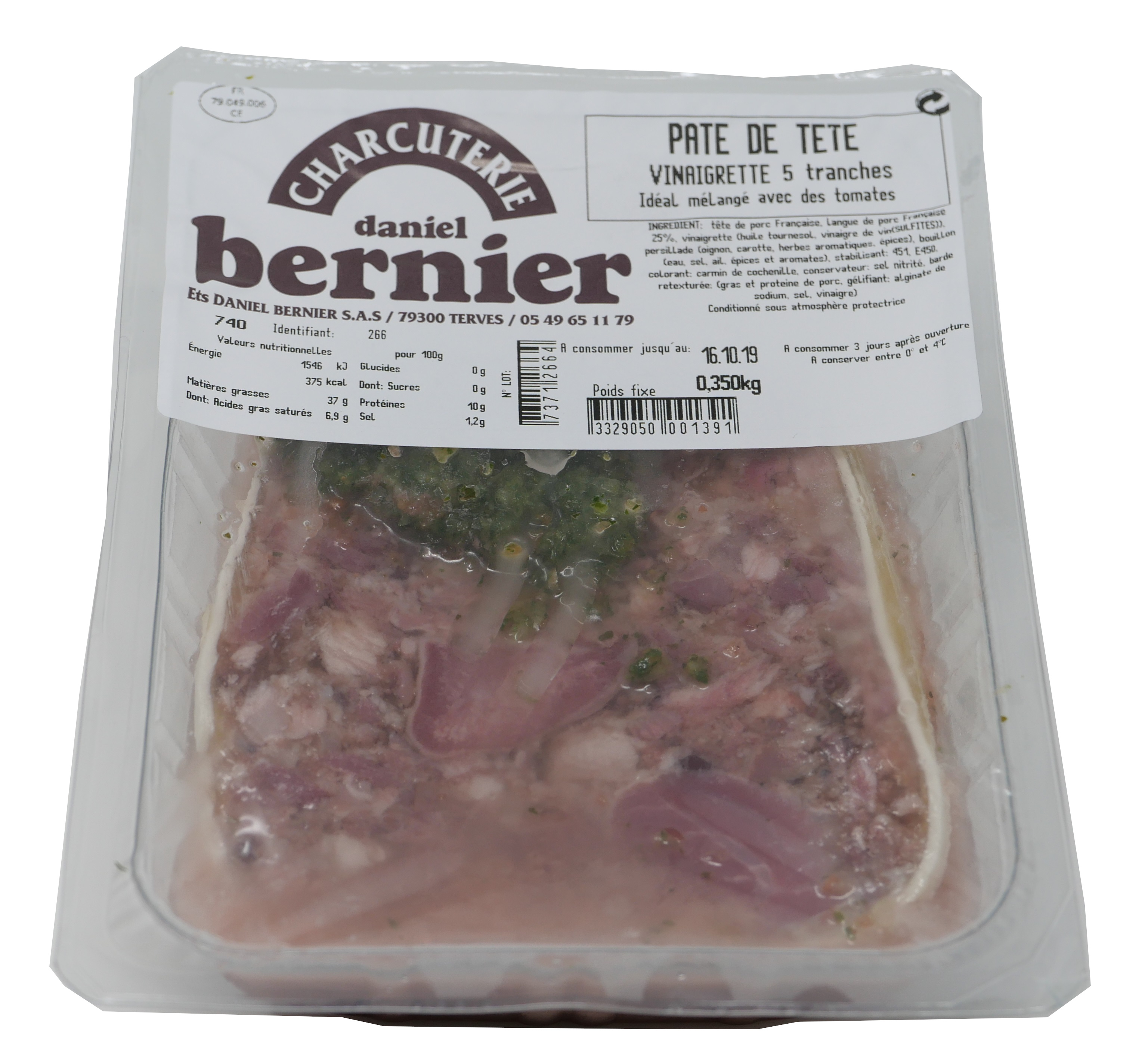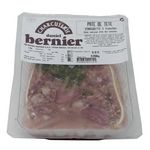 Tête de porc, langue de porc 25%, vinaigrette (huile de tournesol, vinaigre de vin), persillade (oignon, carotte, herbes arômatiques, épices), bouillon (eau, oignon, sel, ail, épices et arômates), stabilisant E451i, E450iii, E450i, épices, colorant: E120, conservateur :E250, barde retexturée (gras et proteine couenne de porc, gélifiant: E401, sel conservateur: E202)