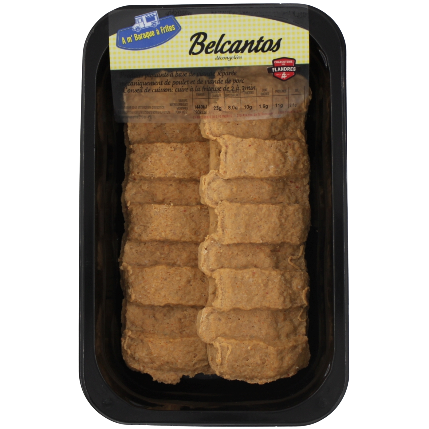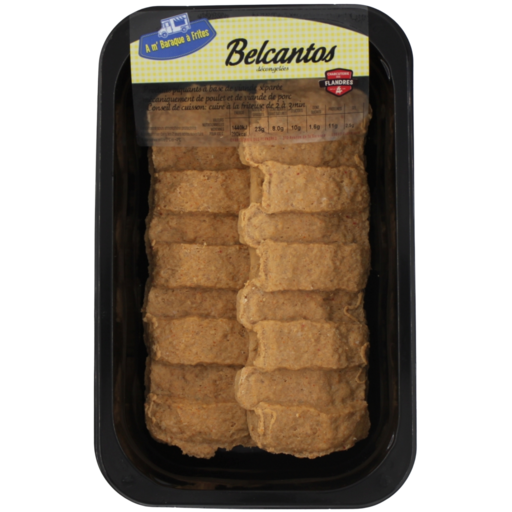 Porc 35% (viande, graisse), viande de poulet séparée mécaniquement 35%, eau, chapelure (farine BLE, eau, levure, sel), sel, légumes secs (oignon, paprika), hydrolysat de protéines SOJA, épices, poudre de légumes (ail), exhausteur de goût (E 621), émulsifiant (E 451i), épaississant (E 415).