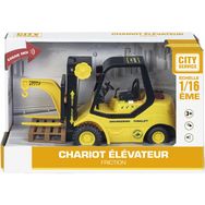 Ce chariot élévateur miniature de 23 cm reproduit fidèlement les détails d'un engin professionnel. Son design robuste et ses finitions métallisées en font un jouet premium, idéal pour les passionnés de véhicules industriels. Les roues pivotantes assurent une maniabilité optimale pour des jeux dynamiques.