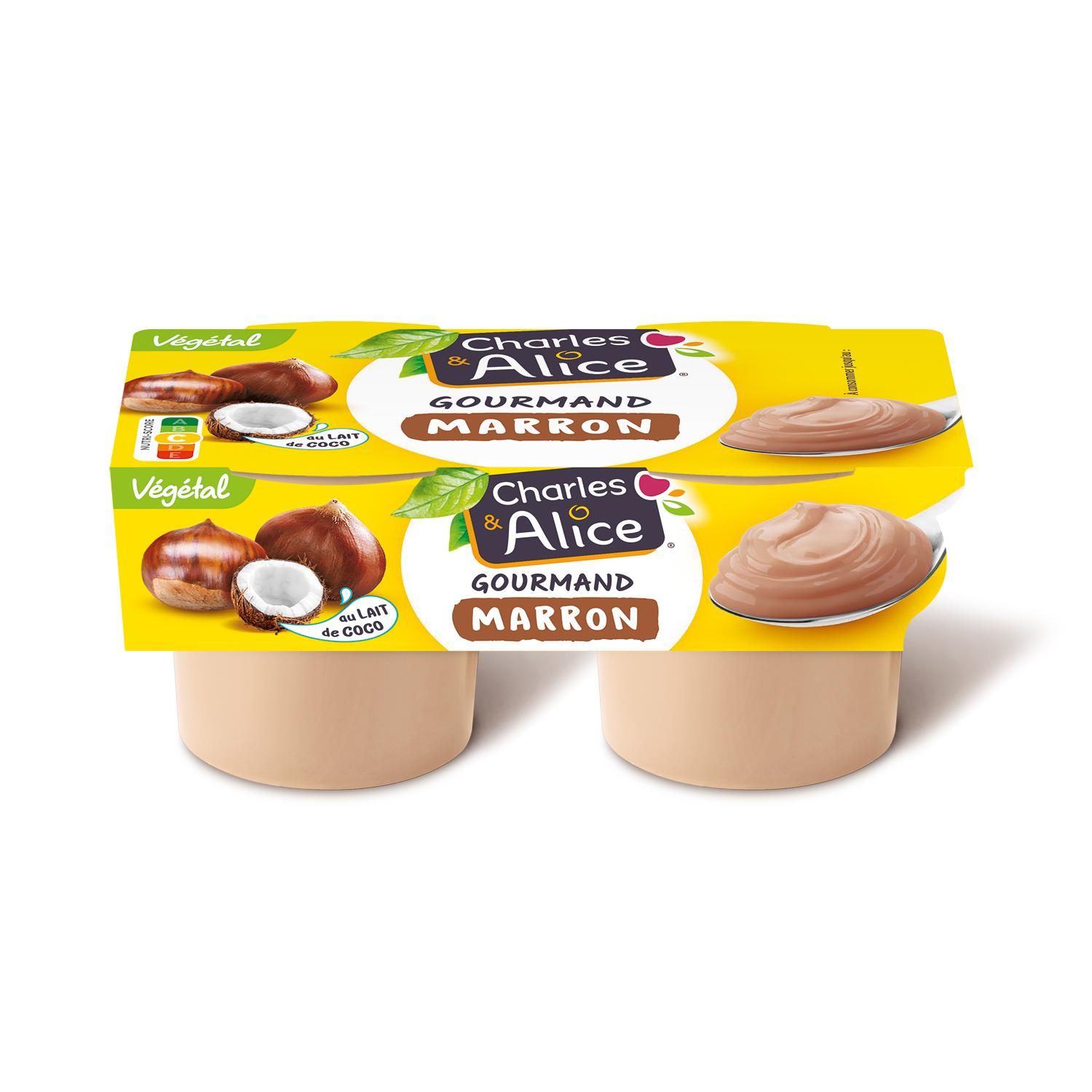 Lait de coco allégé 61% (eau, extrait de noix de coco), crème de marron 30% (sucre, marrons 10.5 %, eau, extrait de vanille), eau, amidon, farine de graine de caroube