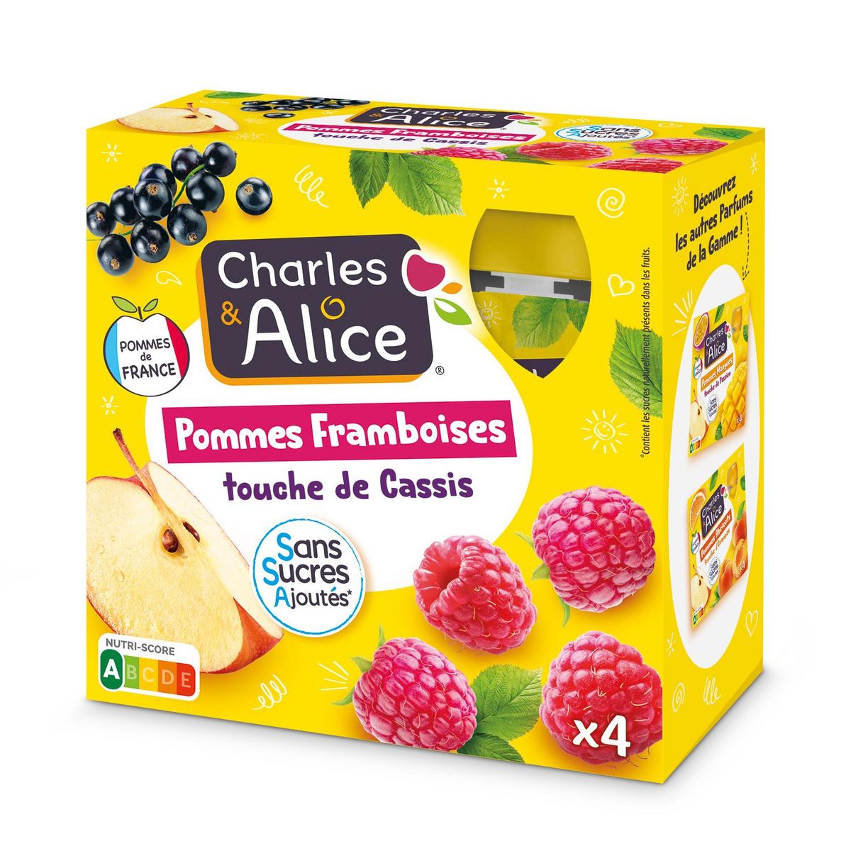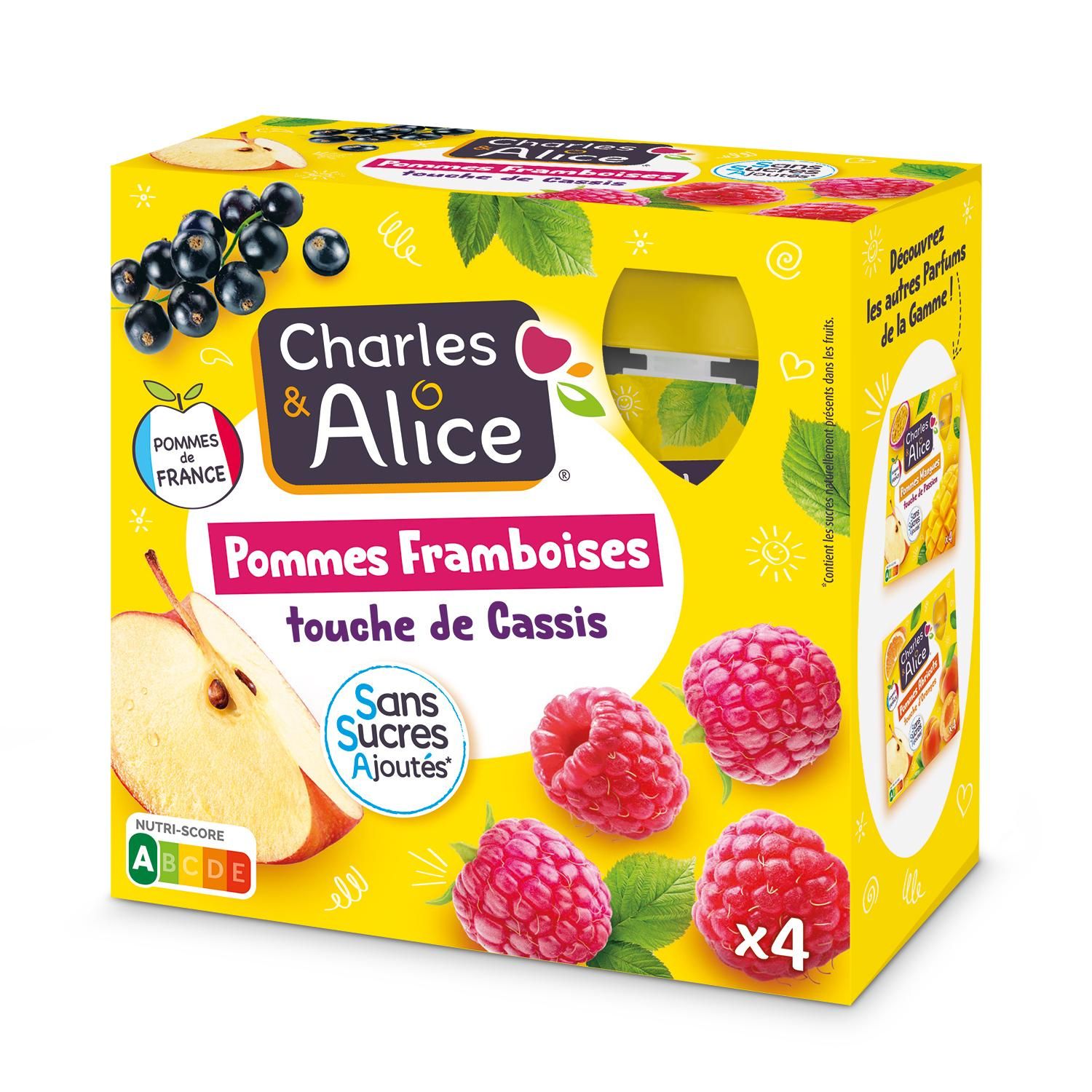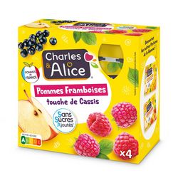 Purée de pommes 81,8%, purée de framboises 17%, purée de cassis 1%, arôme naturel de framboise, antioxydant: acide ascorbique.