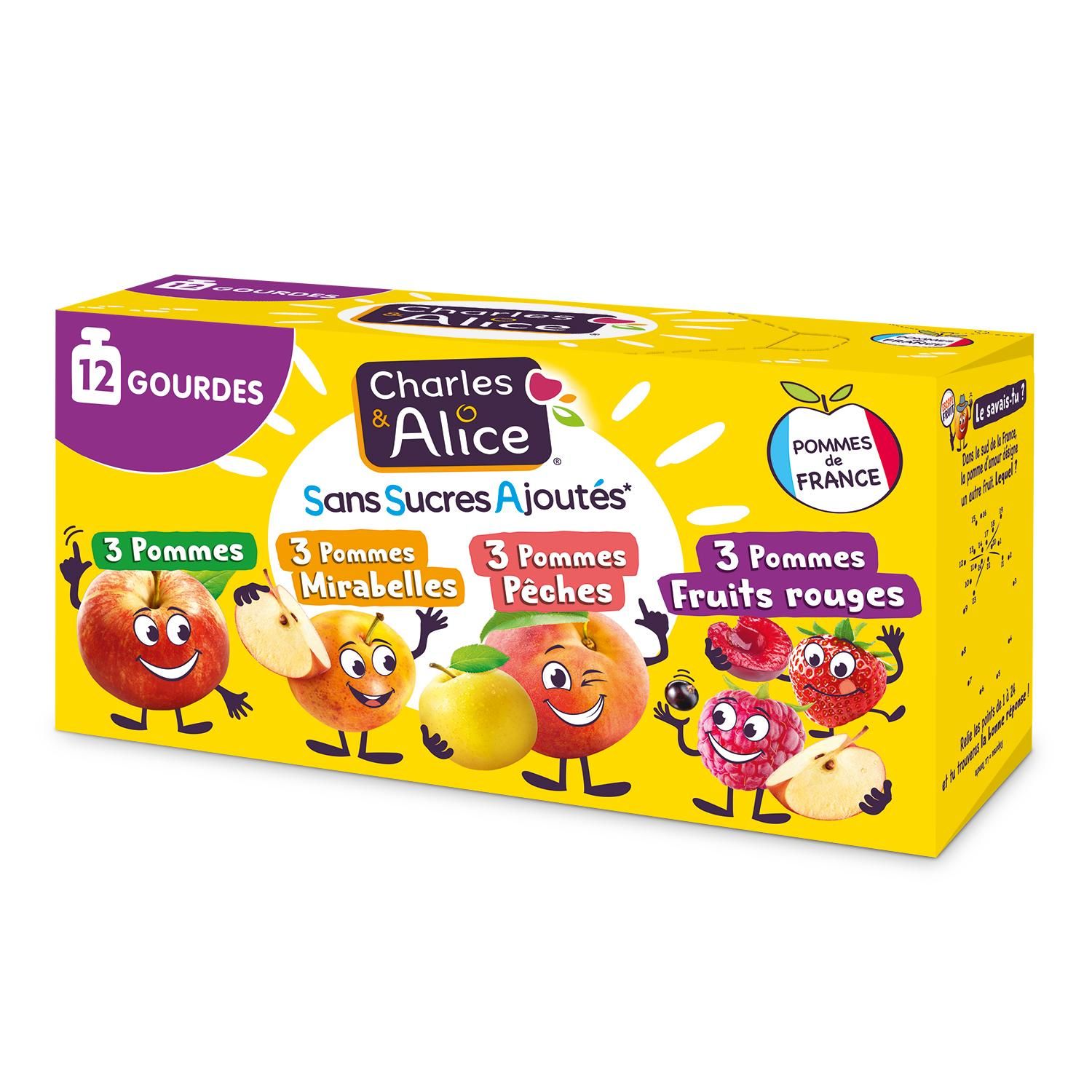 Pommes : Purée de pommes 99,9%, antioxydant: acide ascorbique. Pommes Mirabelles : Purée de pommes 79,8%, purée de mirabelles 20%, arôme naturel de mirabelle, antioxydant: acide ascorbique. Pommes Pêches : Purée de pommes 69,7%, purée de pêches 30%, arôme naturel de pêche, antioxydant: acide ascorbique. Pommes Fruits rouges : Purée de pommes 87,6%, purée de cerises 5%, purée de fraises 3%, purée de cassis 2%, purée de framboises 2%, arôme naturel, jus concentré de carotte pourpre, antioxydant: acide ascorbique.