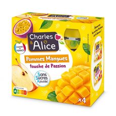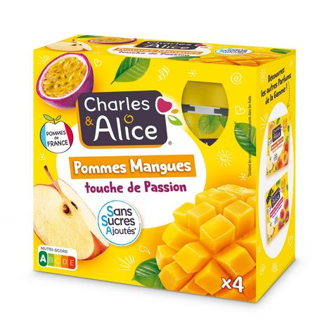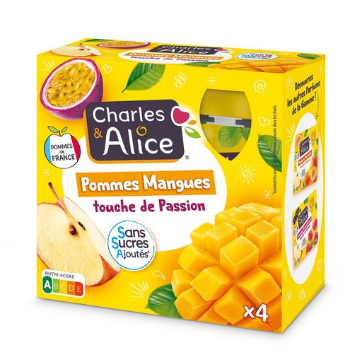 Purée de pommes 70,9%, purée de mangues 25%, purée de fruits de la passion 4%, antioxydant: acide ascorbique.