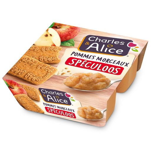 Purée et morceaux de pommes 80%, eau, sucre, spéculoos 4,6% (farine de BLE, sucre, huile végétale (colza), sirop de sucre , concentré de BEURRE sans lactose, poudre à lever : carbonate acide de sodium, sel, cannelle), arôme naturel, cannelle, antioxydant : acide ascorbique, acidifiant : acide citrique, sel.