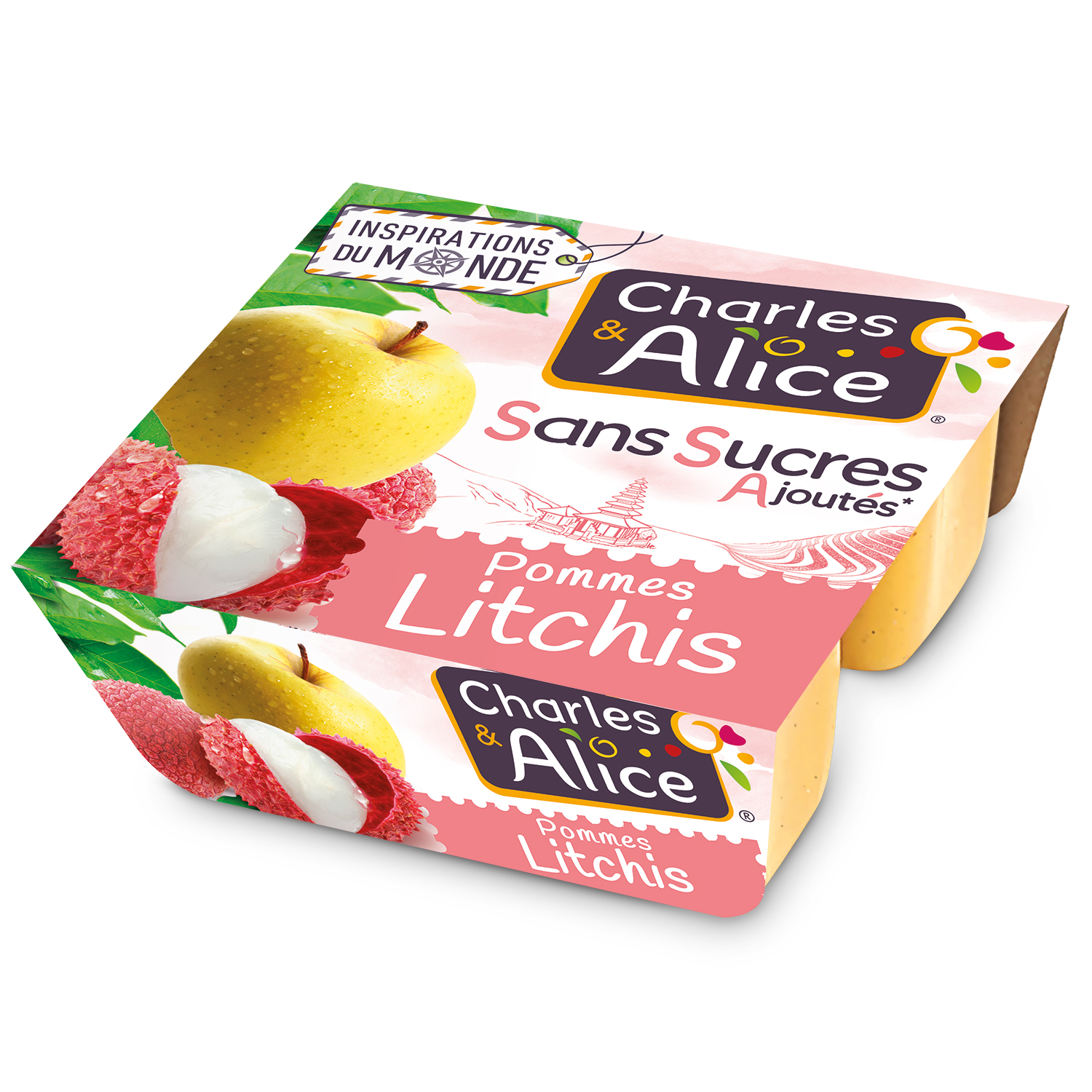 Purée de pommes 77.9%, purée de litchis 22%, antioxydant : acide ascorbique.