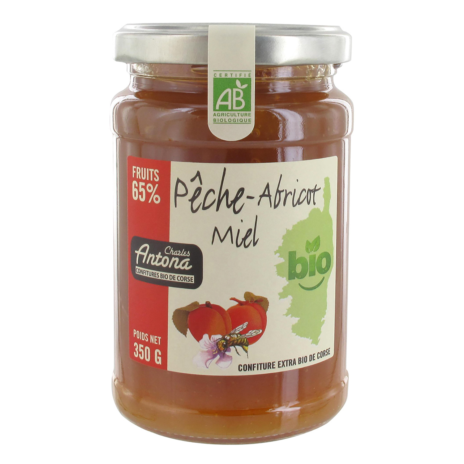 Fruits (pêches* 50%, abricots* 50%), sucre de canne*, miel de corse AOP* 1,2%, gélifiant : pectine de fruit, jus de citron*. *Issus de l’agriculture biologique.