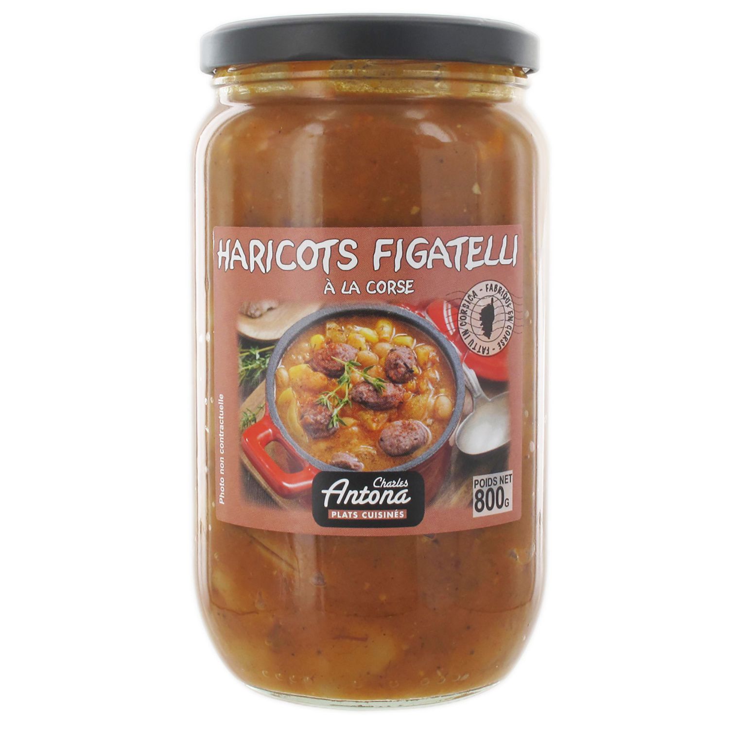 Haricot de Soisson (France) 40%. Sauce cuisinée : eau, oignons, lardons fumés (poitrine de porc, sel, arômes naturels, ferments), purée de tomate double concentré, farine de BLE, ail, sel, poivre, laurier, thym. Garniture : figatelli 12% [viande et gras de porc, foie de porc, sel nitrité, liant (LACTOSE, dextrose, sirop de glucose), poivre, ail, boyaux naturels]. Origine France, pour les viandes de porc.