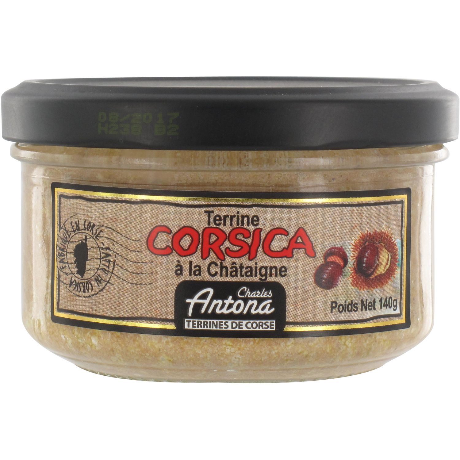 Gras de porc, foie de volaille, viande de porc, châtaignes 20%, oignons, eau de vie de vin, sel, fécule de pomme de terre, poivre, thym