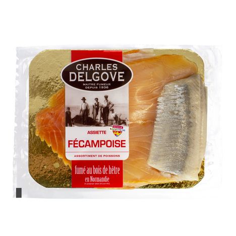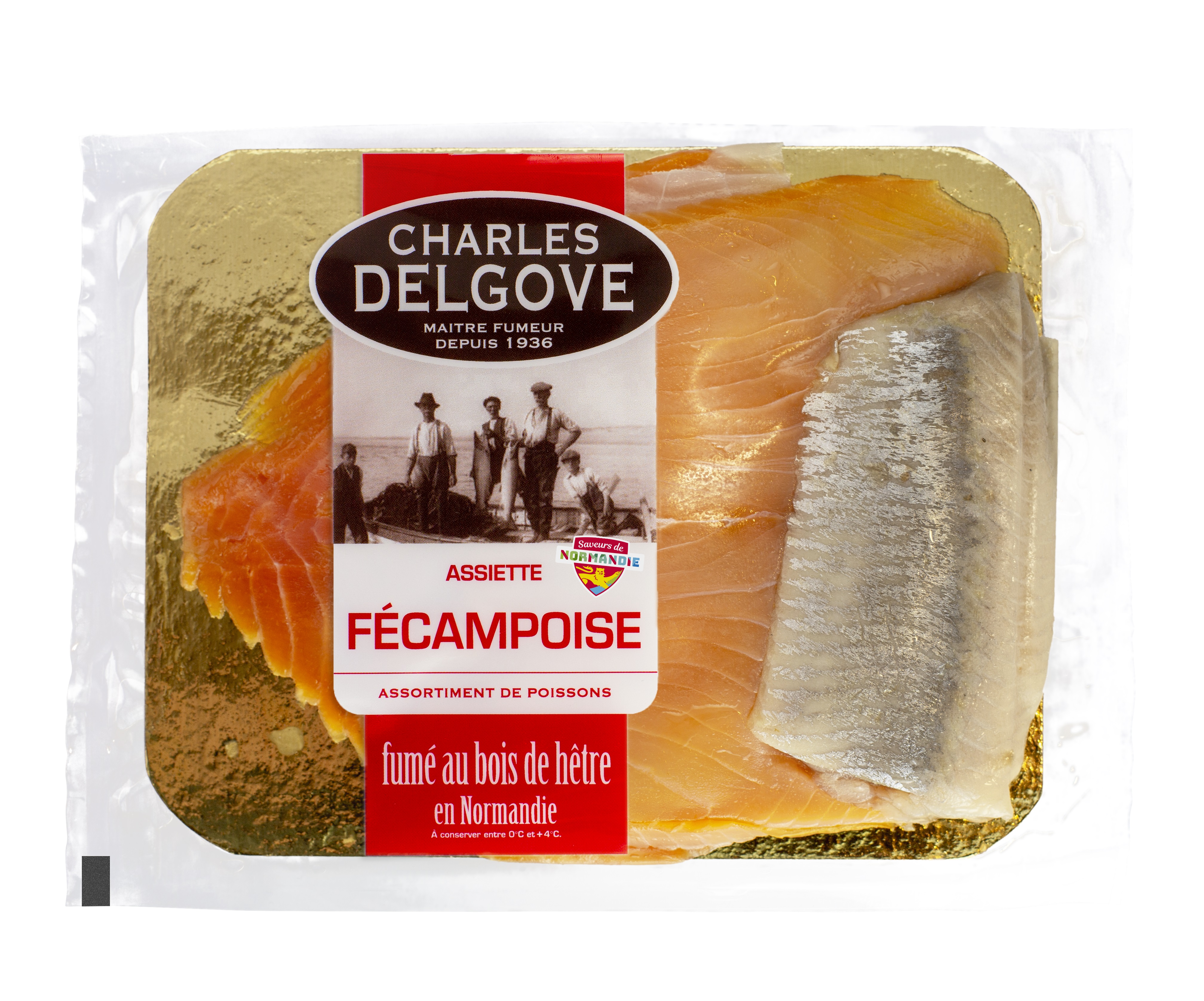 ASSIETTE DE PRODUITS FUMES A BASE DE HARENG SAUMON CABILLAUD ET TRUITE ASSIETTE FECAMPOISE