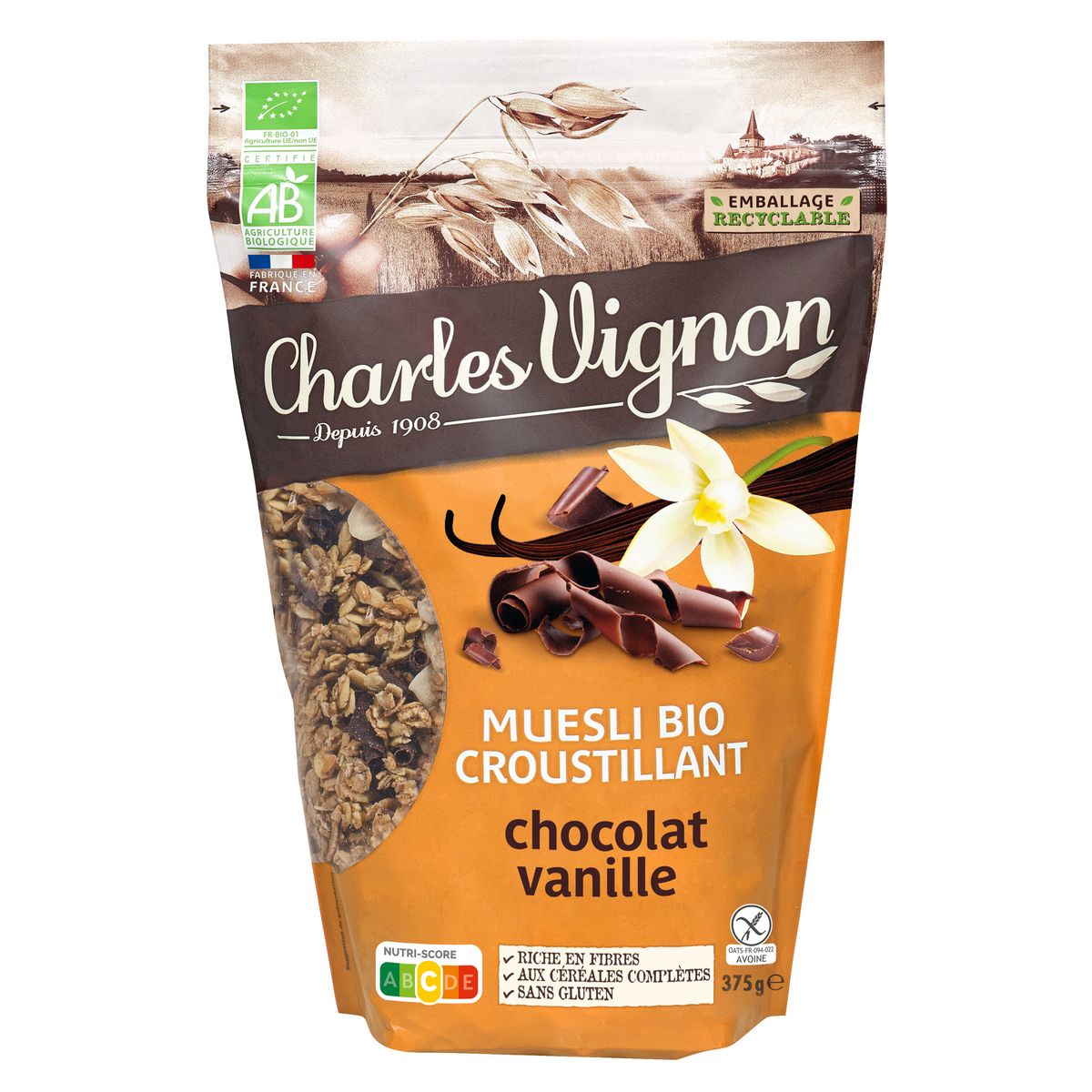 Céréales bio muesli croustillant chocolat vanille sans gluten