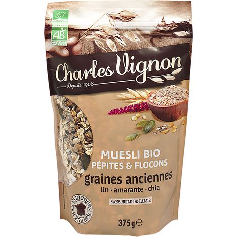 Muesli Bio Pépites & Flocons Graines anciennes L’association inédite de pépites de céréales croustillantes et de flocons d’avoine complets, dans une recette au goût savoureux de graines anciennes.