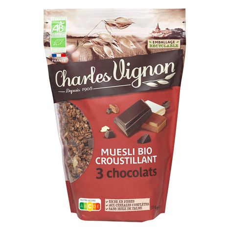 Céréales complètes : pépites croustillantes 3 chocolats : noir, au lait et blanc.
