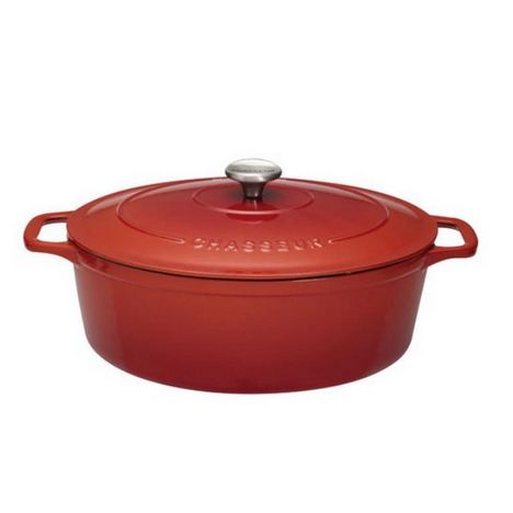 Chasseur PUC473358 Cocotte ovale en fonte émaillée 33cm PUC473358 CHASSEUR est idéale pour préparer de délicieux plats mijotés. Elle trouvera autant sa place sur le feu que sur la table. - Forme : ovale.Matière : fonte émaillée.Bouton acier.Émaillage intérieur et extérieur.Coloris : rubis.Diamètre :