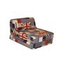 Cette chauffeuse aux imprimés BRITISH est aussi décorative en fauteuil pouf que pratique lorsqu'elle est dépliée en lit d'appoint.