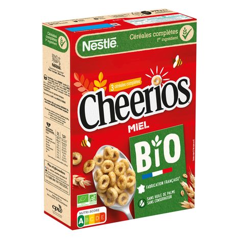 Découvrez les céréales CHEERIOS BIO, de délicieux petits anneaux enrobés de miel. Fabriquées en France, les céréales CHEERIOS BIO contiennent du blé complet, des fibres et sont sans huile de palme et sans arôme artificiel* ! Et pour varier les sensations et les plaisirs, retrouvez également CHOCAPIC BIO, de délicieux pétales au chocolat, NESQUIK BIO, de gourmandes billes cacaotées et les céréales LION® BIO avec leur savoureux mélange de chocolat et de caramel. *conformément à la réglementation sur l'agriculture biologique.