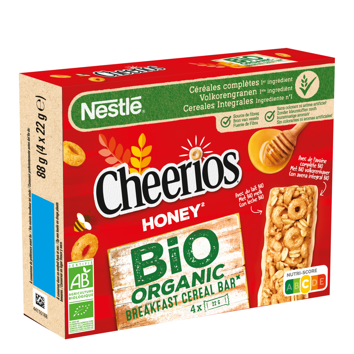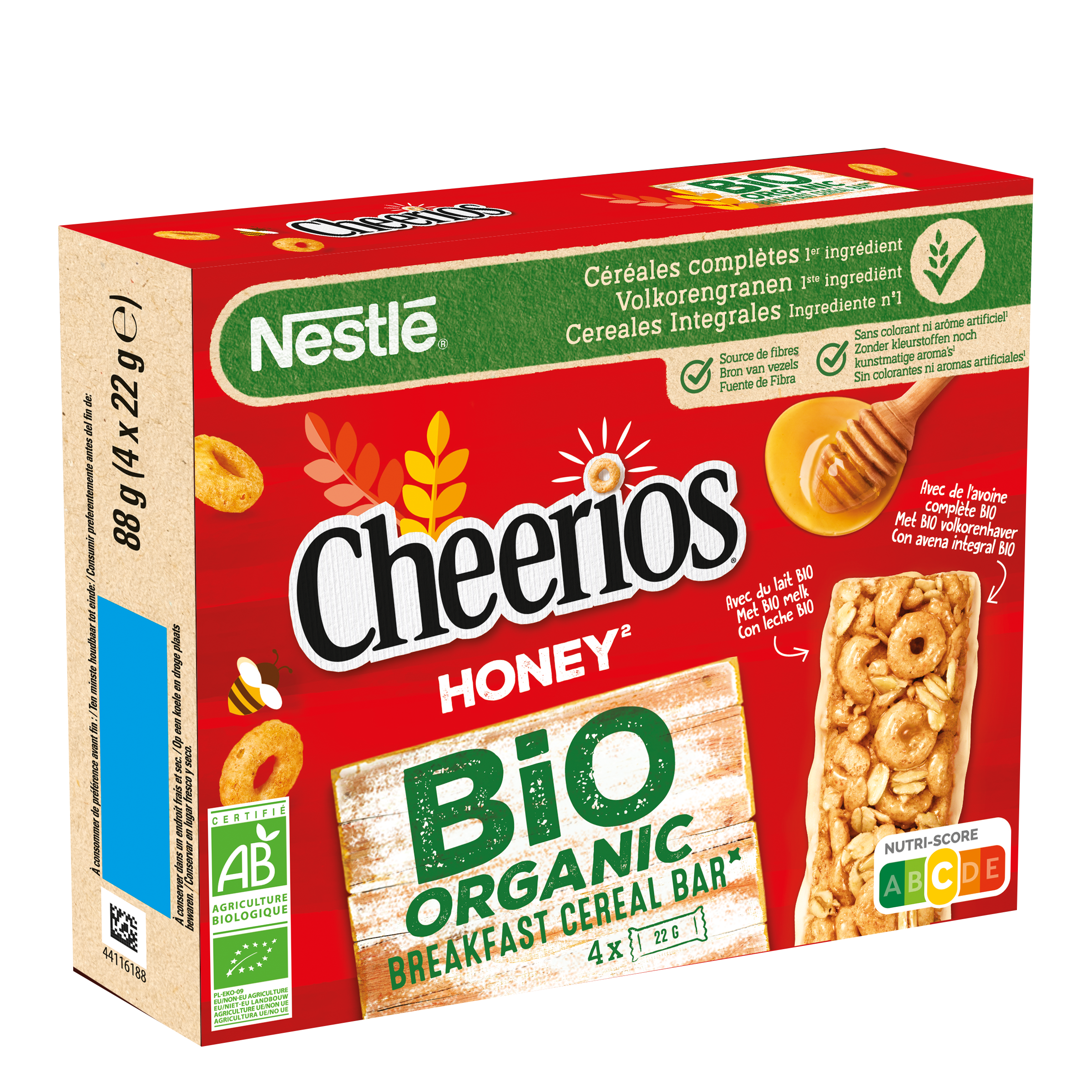 Ingrédients: Flocons d'AVOINE complète* 20,5%, chocolat blanc* 14,4% (beurre de cacao* 4,8%, inuline [fibre]*, sucre*, LAIT entier en poudre* 2,2%, émulsifiant : lécithine de tournesol*), huile de tournesol*, dextrose*, sirop de glucose*, farine d'AVOINE complète* 7,4%, farine de BLE complet* 7,4%, LAIT concentré sucré* 7,0% (LAIT* 3,8%, sucre*), farine de riz*, farine d'ORGE complète* 4,4%, sucre*, miel* 2,0%, amidon de BLE*, farine de maïs complet* 0,5%, farine de riz complet* 0,5%, sirop de sucre inverti*, sel, farine de malt d'ORGE*, émulsifiant : lécithine de tournesol* ; mélasse*, antioxydant : extrait riche en tocophérols ; arôme naturel. *Ingrédients issus de l'agriculture biologique. Peut contenir du soja et des fruits à coque.
