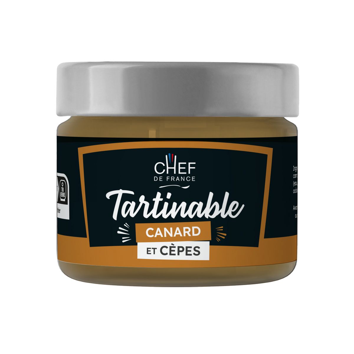 Graisse de canard 27,7%, crème (crème de LAIT, stabilisant : carraghénanes), foie de canard maigre 19,9%, LAIT, foie de volaille, cèpes secs réhydratés (cèpes secs, eau) 4%, ŒUF, sel, échalote, sucre, arôme, poivre, muscade, antioxydant : acide ascorbique.