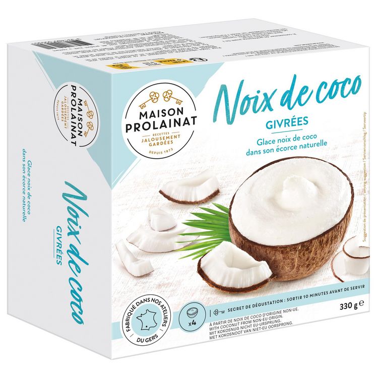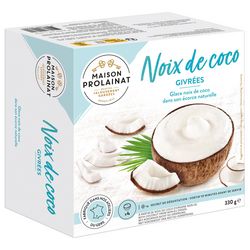Dessert glacé composé d'une glace à la noix de coco 97,9% avec de la noix de coco rapée 2,1% dans son écorce naturelle de fruit, surgelé.