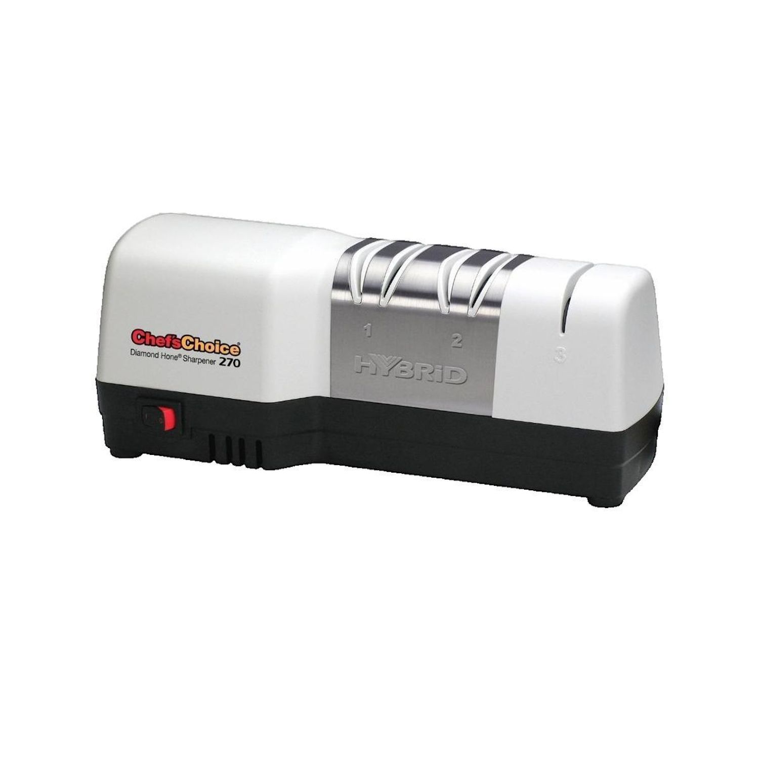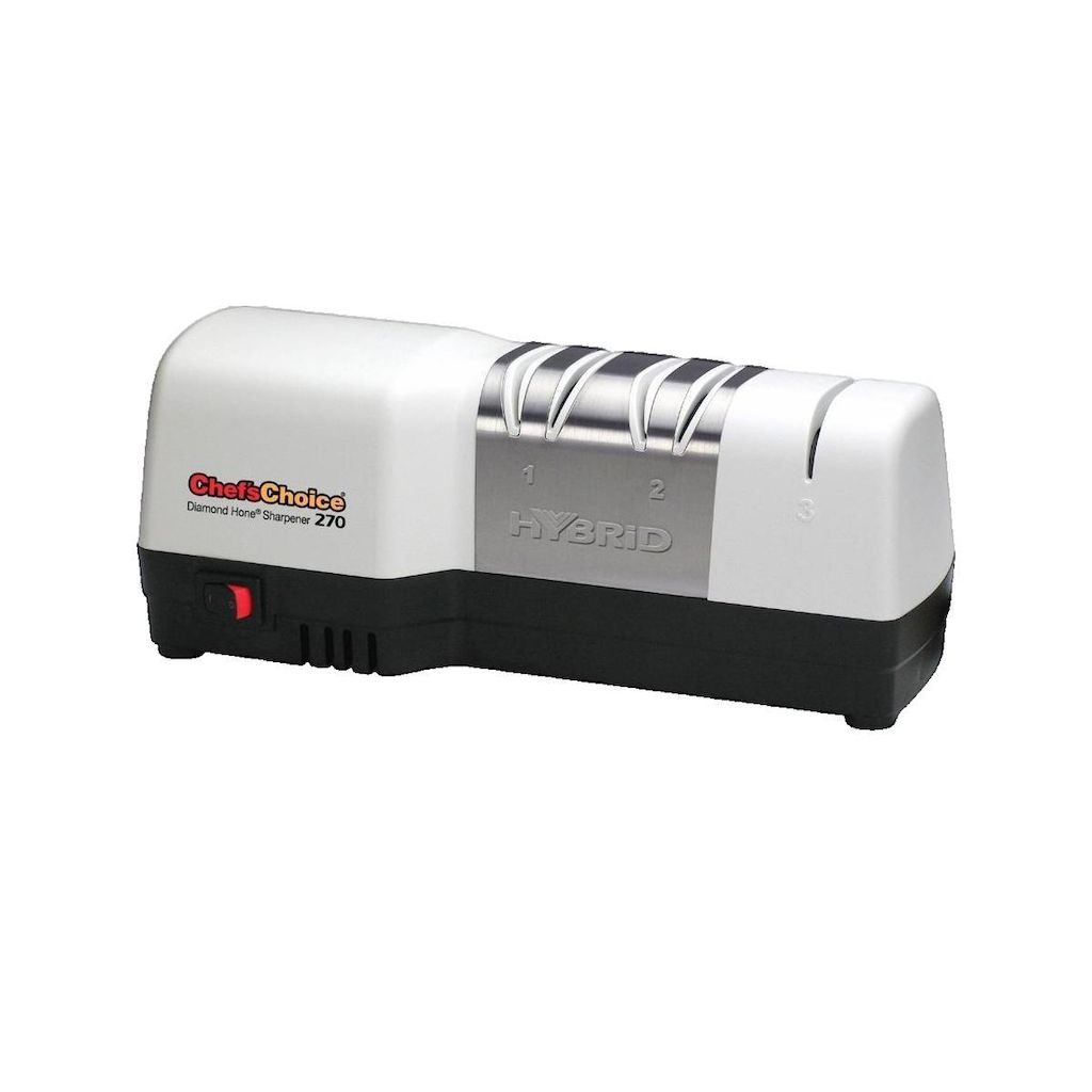 L'Aiguiseur électrique Chef's Choice Hybrid 270 est un appareil conçu pour affûter et entretenir vos couteaux de cuisine. Ce modèle combine un pré-aiguisage électrique, un aiguisage électrique et un affûtage manuel, adapté à tous types de lames, qu'elles soient lisses ou dentées. Grâce à sa concepti