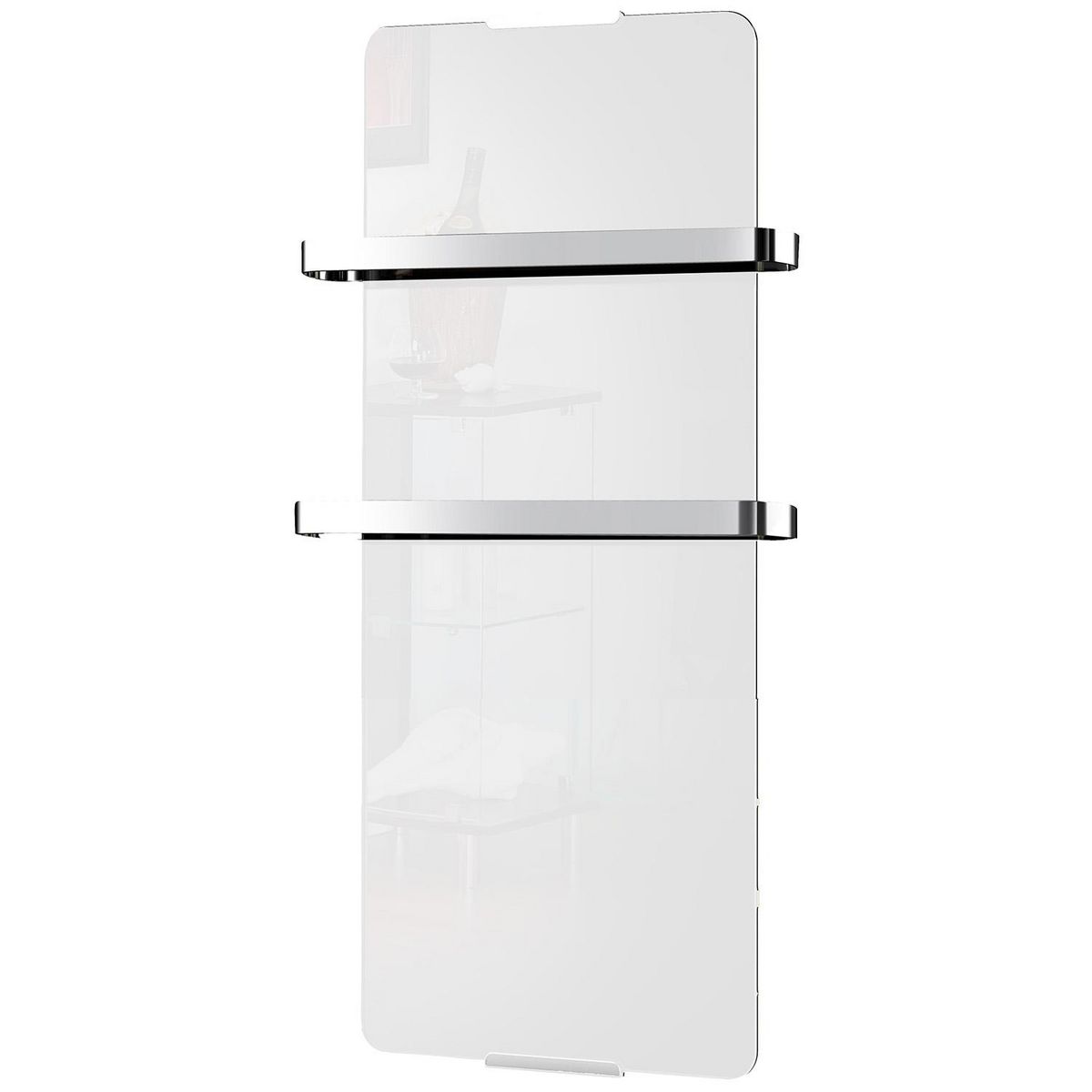 Ultra design, ce sèche-serviette blanc dispose d'une structure en acier inox et d'un revêtement frontal en verre trempé blanc (traité anti coupure) de 5 mm d'épaisseur effet miroir !
