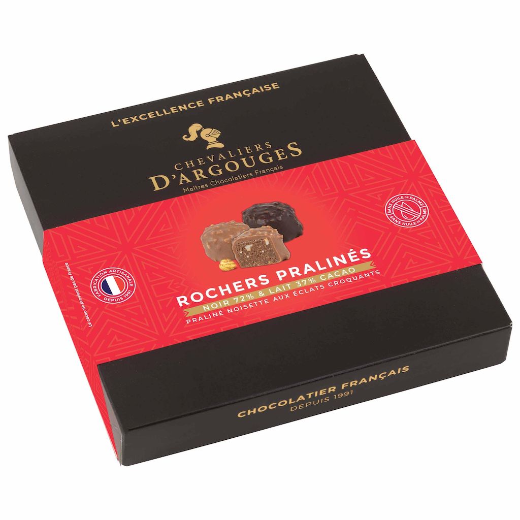 Fondez de plaisir pour notre assortiment de rochers chocolat noir 70% et lait 33% de cacao le tout présenté dans un élégant coffret 164 g. Le craquant de nos enrobages et le croquant de notre praliné noisette sauront à coup sûr satisfaire vos papilles. Pour vous ou pour offrir, nous sommes certains que vous saurez faire le bon choix pour vivre un instant gourmand inoubliable !