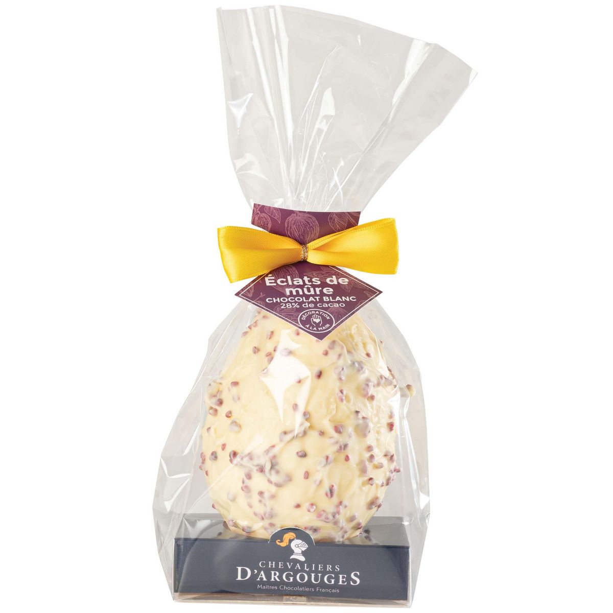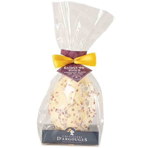 Vivez un instant gourmand unique en dégustant notre savoureux œuf chocolat blanc 28,3% de cacao aux éclats de mûres !