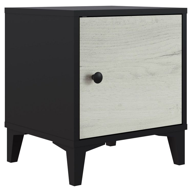 Chêvet 1 Porte fabriqué en mélamine noir mat pour le corps du meuble et mélamine chêne blanchi pour la porte. Pieds en noir. Poignée bouton en noir. Très pratique.