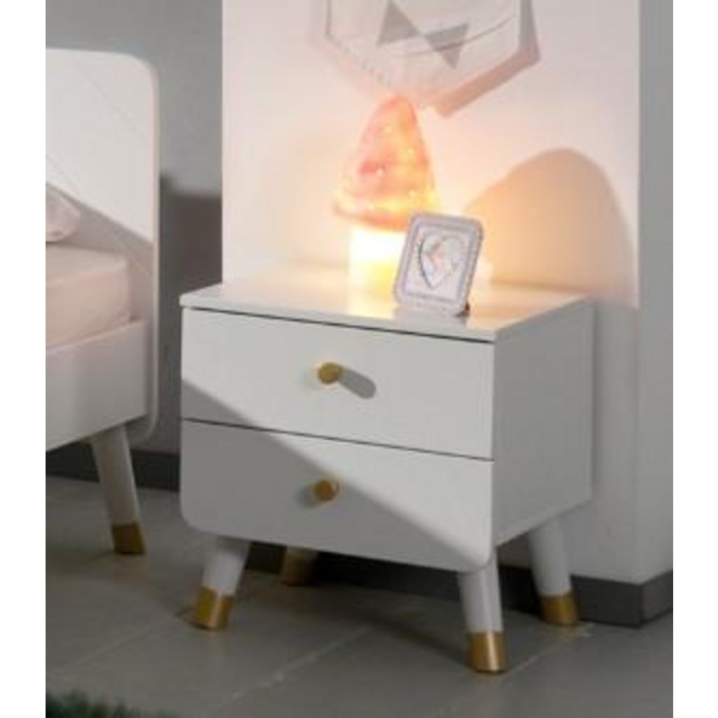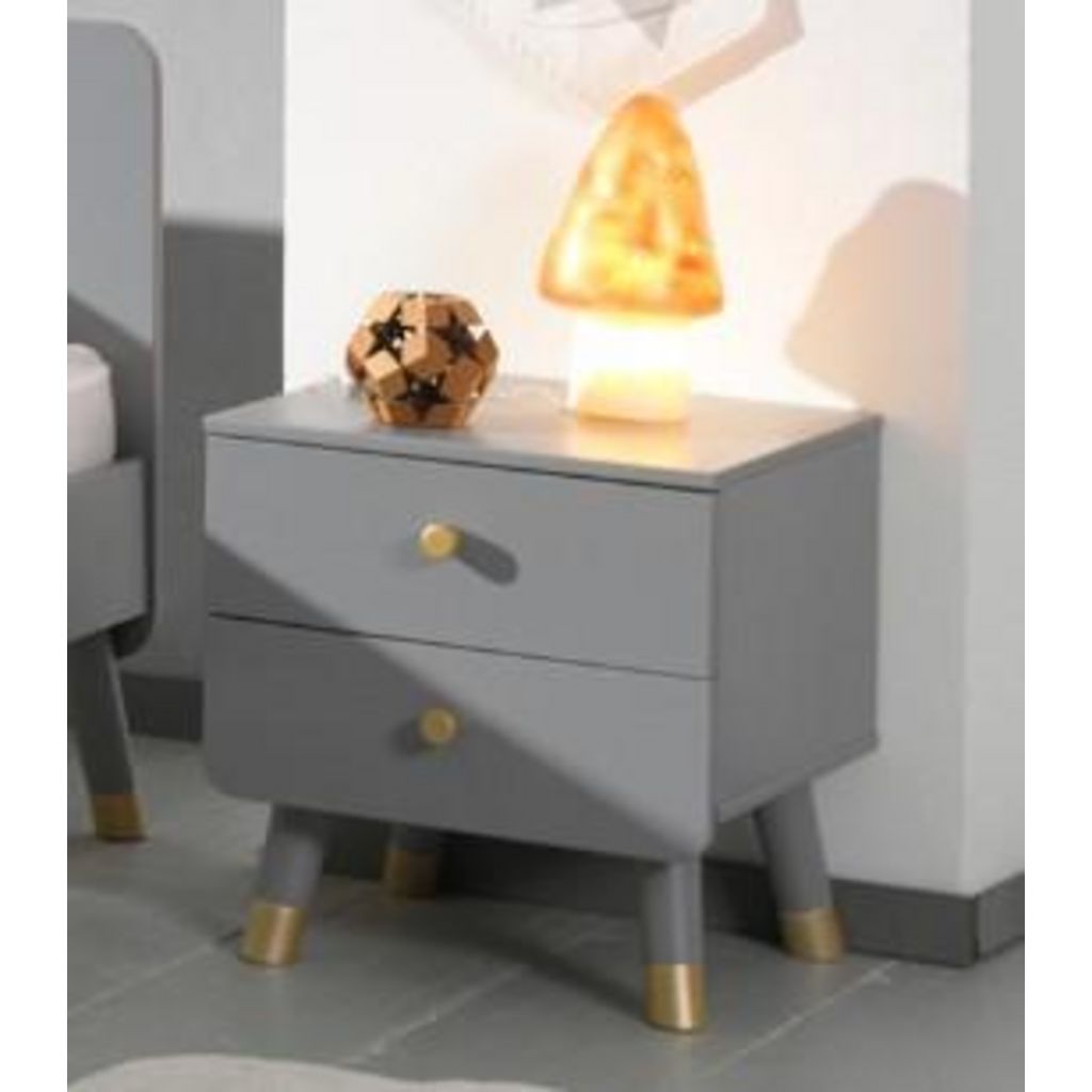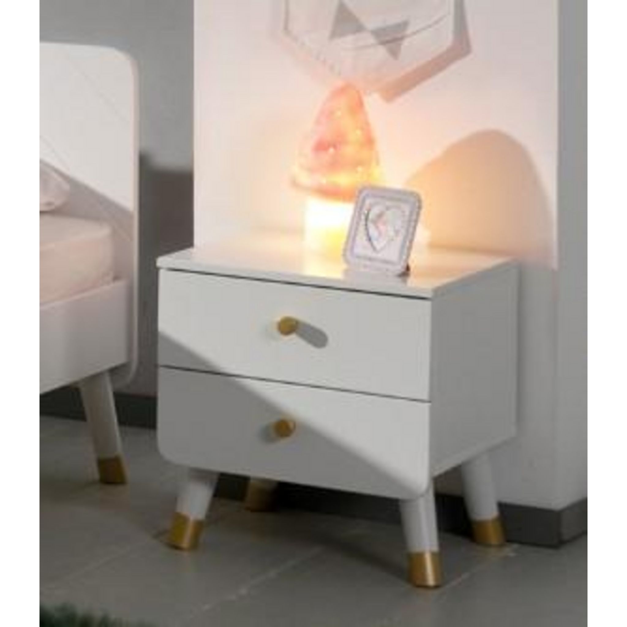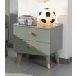 Le chevet Emmy à l'esprit scandinave, viendra apporter une touche design avec son coloris bicolore. Les détails dorés, notamment les pieds et les boutons de tiroirs habillent de façon élégante ce petit meuble de rangement. Quelque soit le coloris, vert, gris, rose ou blanc n'hésitez pas à l'accorder au lit de votre enfant!