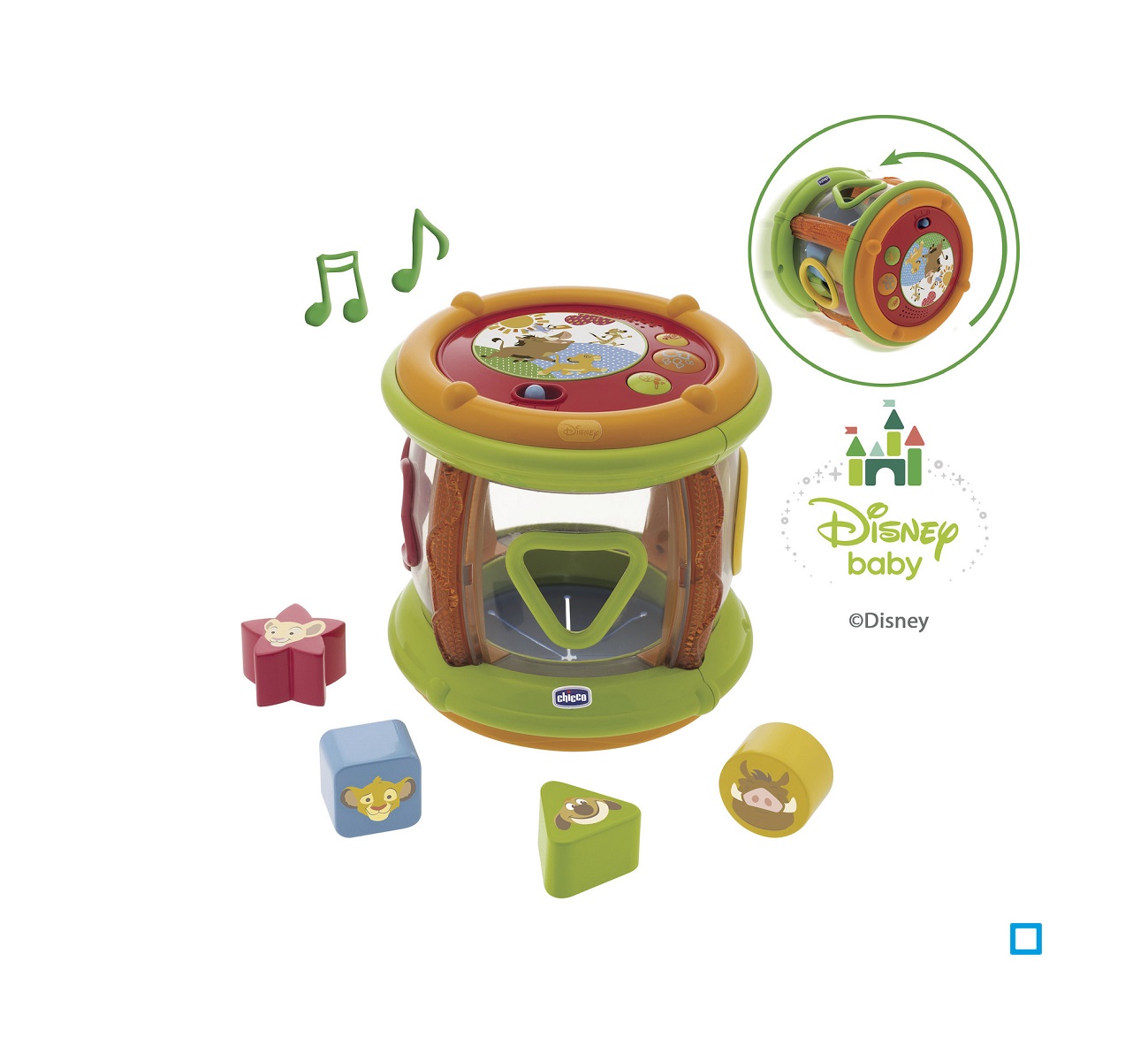 Redécouvrez l'univers du Roi Lion avec ce tambour 2 en 1 de Chicco : d'un côté un tambour électronique pour l'apprentissage de la rythmique et la musicalité, d'un autre une boîte à formes. Tout pour que bébé apprenne tout en s 'amusant !