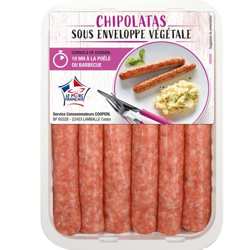 6 Chipolatas sous enveloppe végétale Du porc haché et agrémenté d'épices confectionné en forme de chipolata, recouverte d'une enveloppe végétale.