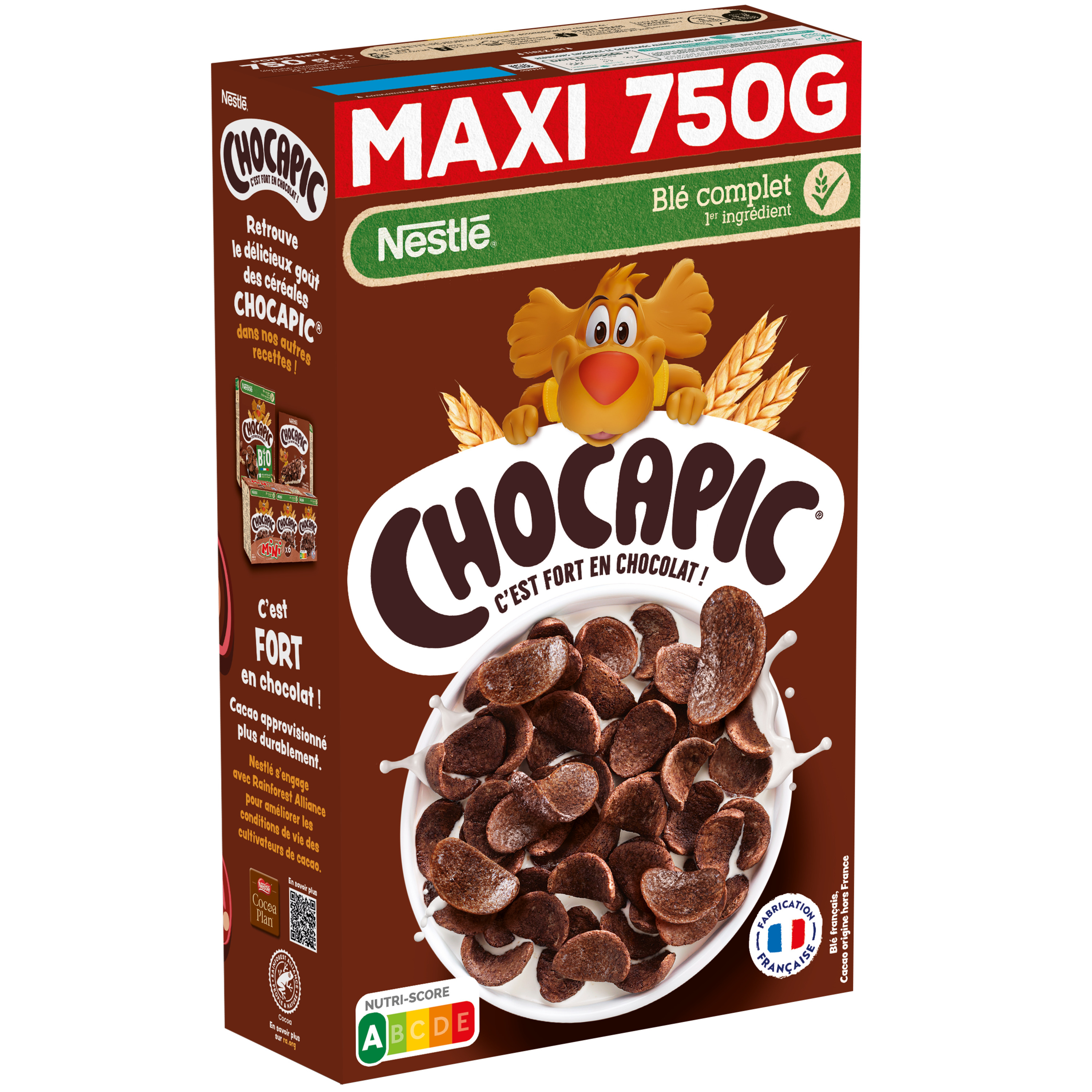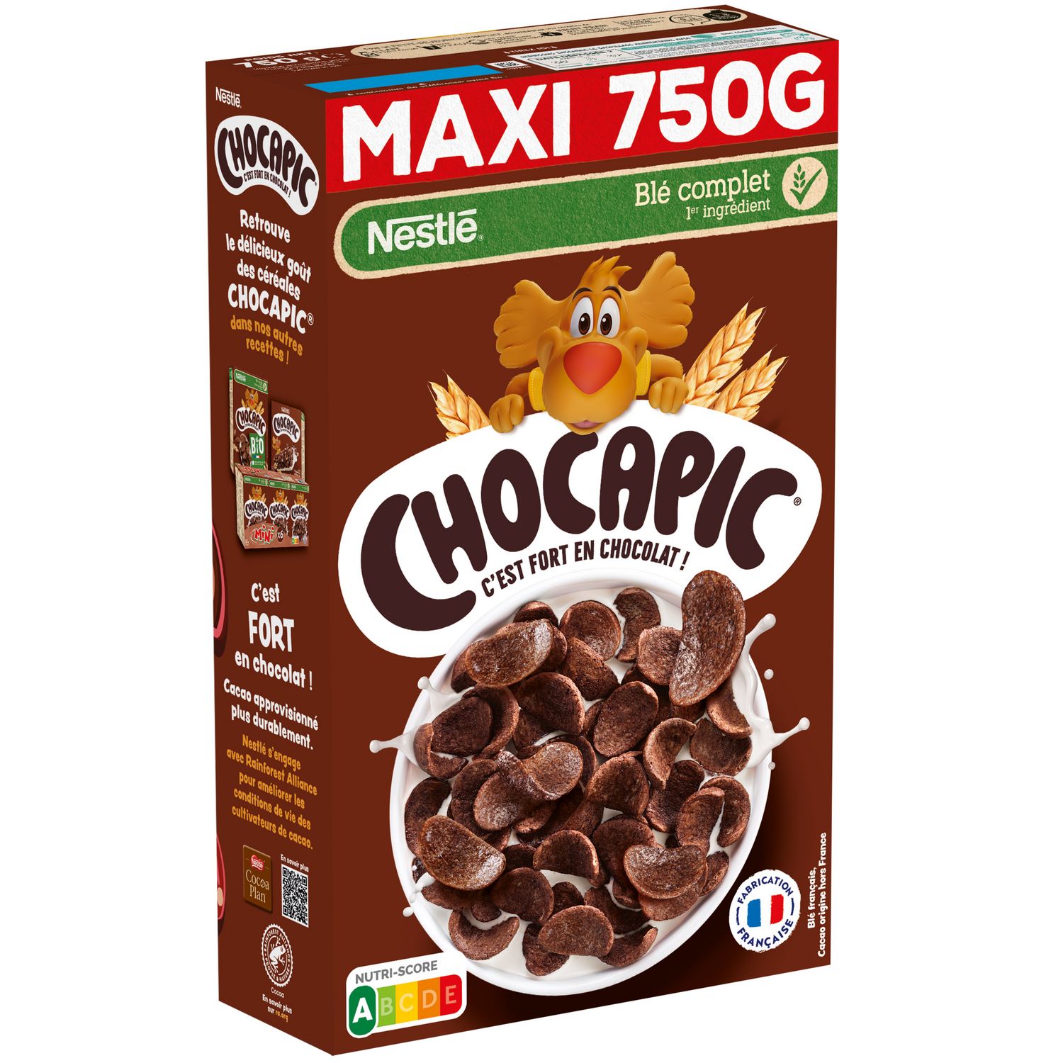 Découvrez les céréales CHOCAPIC® dans un paquet de 750g : de délicieuses pétales de céréales au goût fort en chocolat pour le petit-déjeuner. Fabriquées en France, elles contiennent du blé complet cultivé plus durablement. La recette des pétales de céréales chocolatées est notée Nutri-Score A et elle est sans colorant ni arôme artificiel. Et pour varier les plaisirs, CHOCAPIC® existe aussi en version BIO et en barres de céréales !
