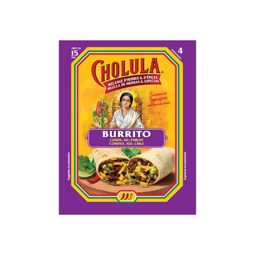 À AJOUTER : • 500g de viande de bœuf haché • 1 c à soupe de concentré de tomate • 125g d'haricots rouges • 140g de maïs en conserve Instructions : - Faites revenir le bœuf, à feu vif, avec un peu d'huile pendant 4 minutes. - Ajoutez ensuite le mélange d'épices Burrito Cholula, mélangez. - Ajoutez le concentré de tomate, 100ml d'eau, le maïs et les haricots rouges égouttés. Mélangez et laissez mijotez une dizaine de minutes à feu doux.- Chauffez vos tortillas et garnissez-les avec le boeuf, quelques morceaux d'avocats arrosés de jus de citron vert, de la laitue émincée, de feuilles de coriandre, du fromage râpé et de la salsa Casera Cholula.