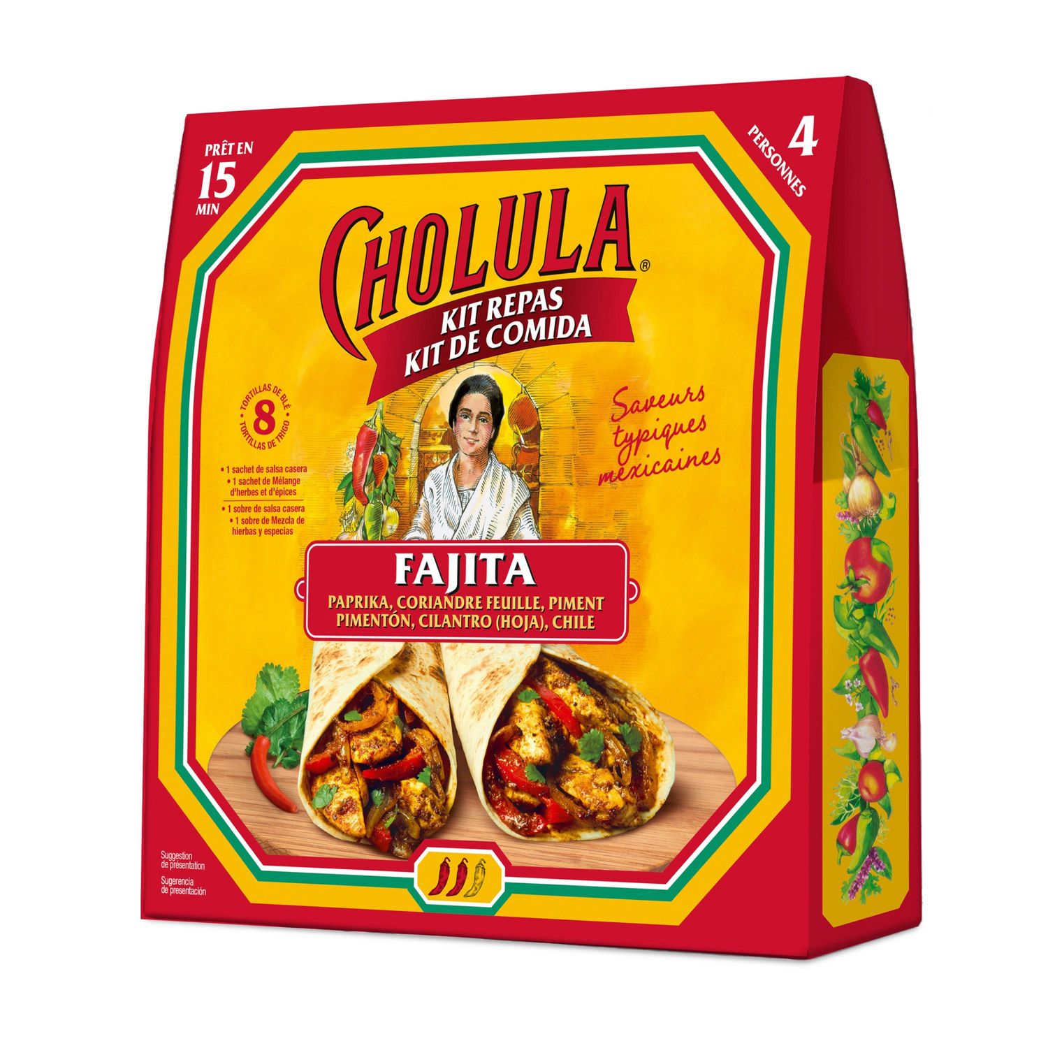 FOP : 8 tortillas de blé BOP : Créée au Mexique il y a plus de 100 ans, Cholula représente la culture culinaire mexicaine authentique. Cet assaisonnement est parfaitement équilibré entre saveurs et piquant, pour rendre votre cuisine tout simplement « suculenta». 1 sachet de salsa casera - 1 sachet de Mélange d'herbes et d'épices Saveur typiques Mexicaines PRÊT EN 15 MIN Préparation - 5 Min