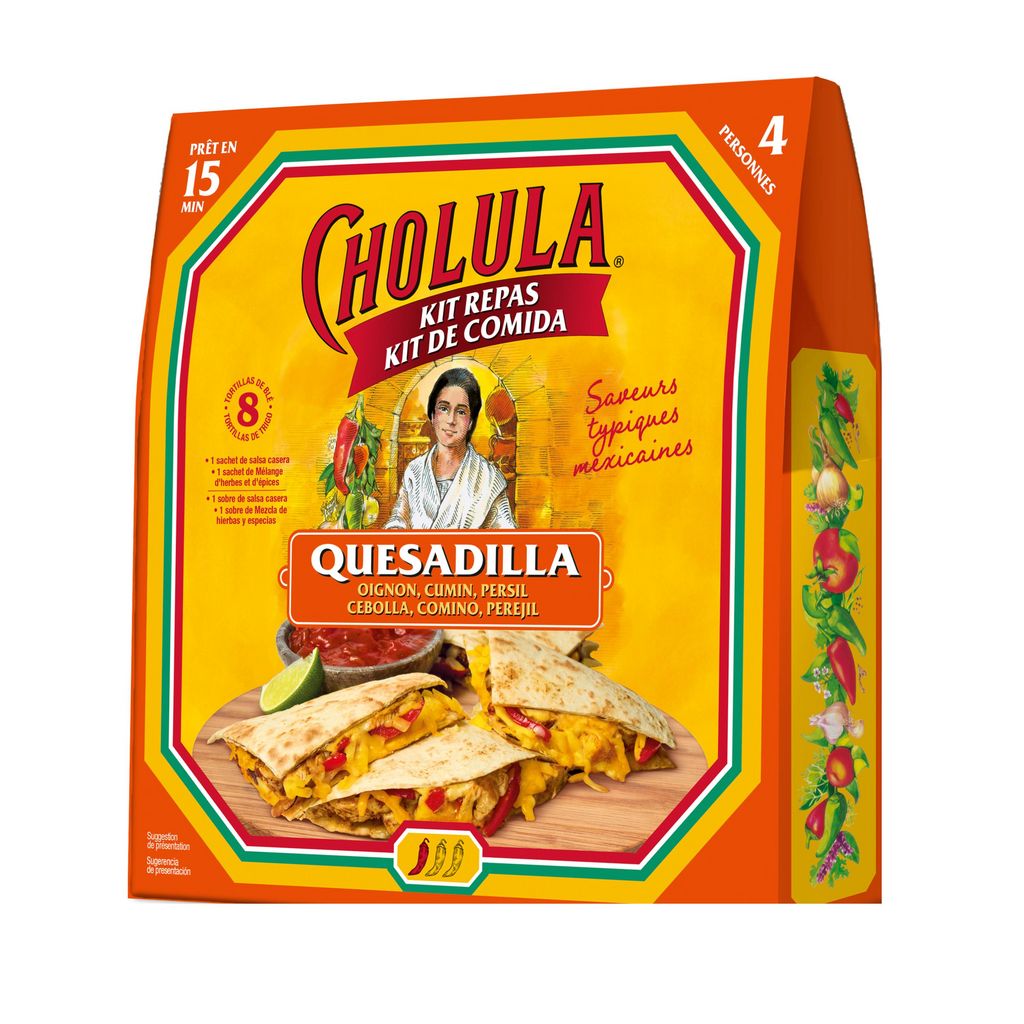 À AJOUTER : • 500g de blancs de poulet• 1 oignon• 1 poivron• 150g de cheddar râpé• 8 tortillas Instructions:1. Émincez finement le poulet, l'oignon et le poivron. Faites revenir à feu vif le poulet dans un filet d'huile, jusqu'à ce qu'il soit bien doré.2. Ajoutez les oignons et les poivrons, laissez mijoter 5 min avant d'ajouter le mélange d'épices Quesadilla Cholula.3. Poursuivre la cuisson 1 minute en mélangeant.4. Sur votre plan de travail, disposez 4 tortillas puis recouvrez-les de cheddar râpé.5. Répartissez le mélange de poulet et de légumes sur le fromage.6. Ajoutez un peu de cheddar puis refermez en couvrant avec une autre tortilla.Faites dorer vos quesadillas dans une poêle,quelques minutes de chaque côté.7. Servez vos quesadillas aussitôt, accompagnées de la salsa casera Cholula et arrosez de jus de citron vert.