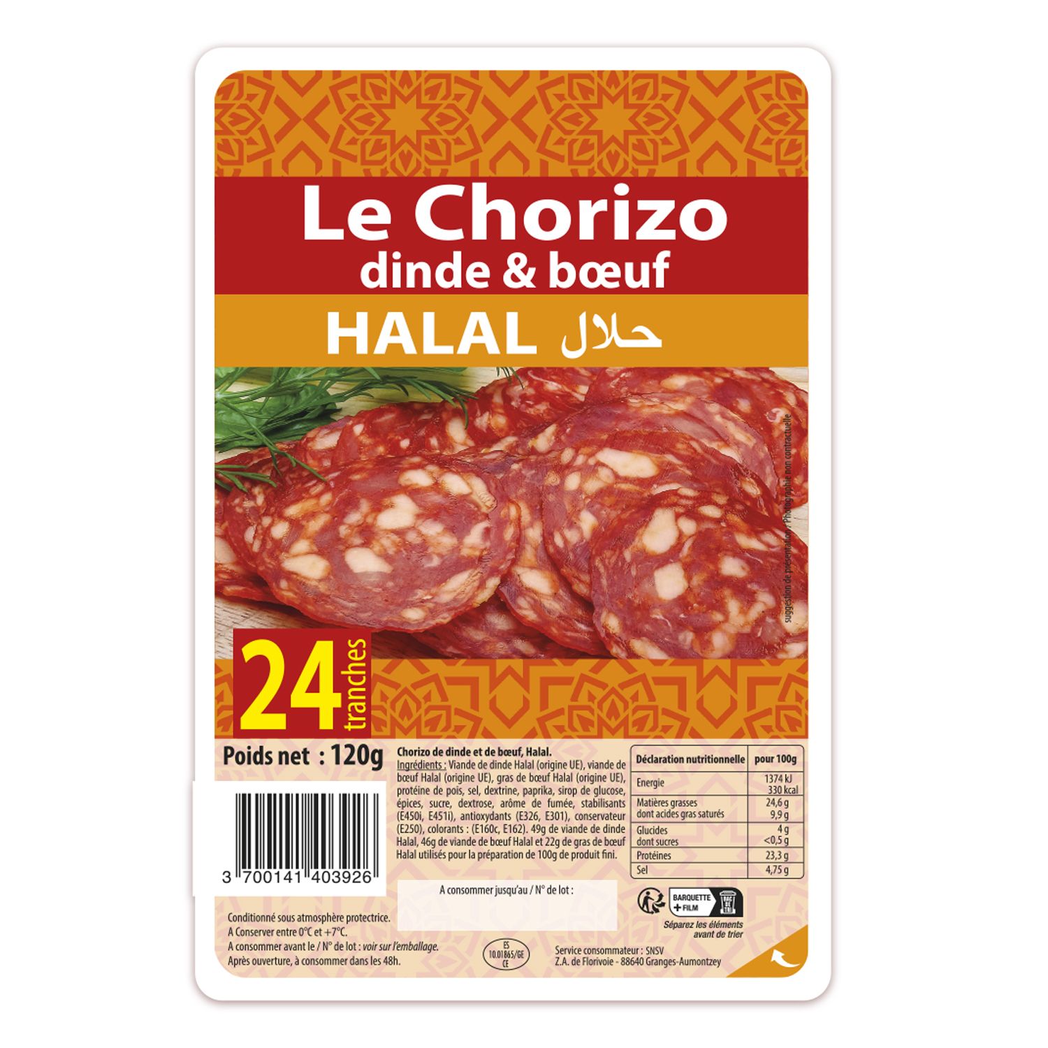 Chorizo boeuf et volaille halal 24 tr 120g NO NAME