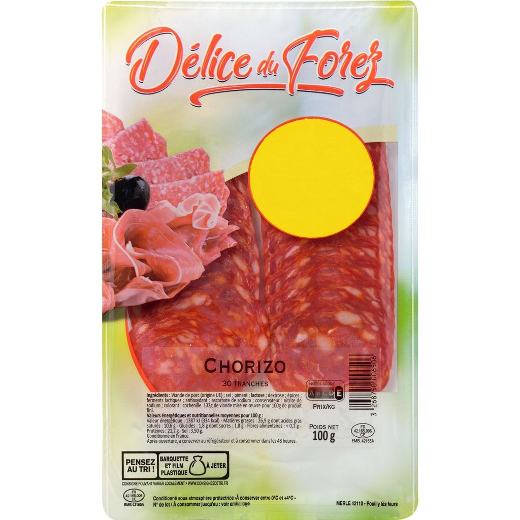 Viande de porc (origine UE) ; sel ; piment ; lactose ; dextrose ; épices ; ferments lactiques ; antioxydant : ascorbate de sodium ; conservateur : nitrite de sodium ; colorant : cochenille. 132g de viande mise en œuvre pour 100g de produit fini.