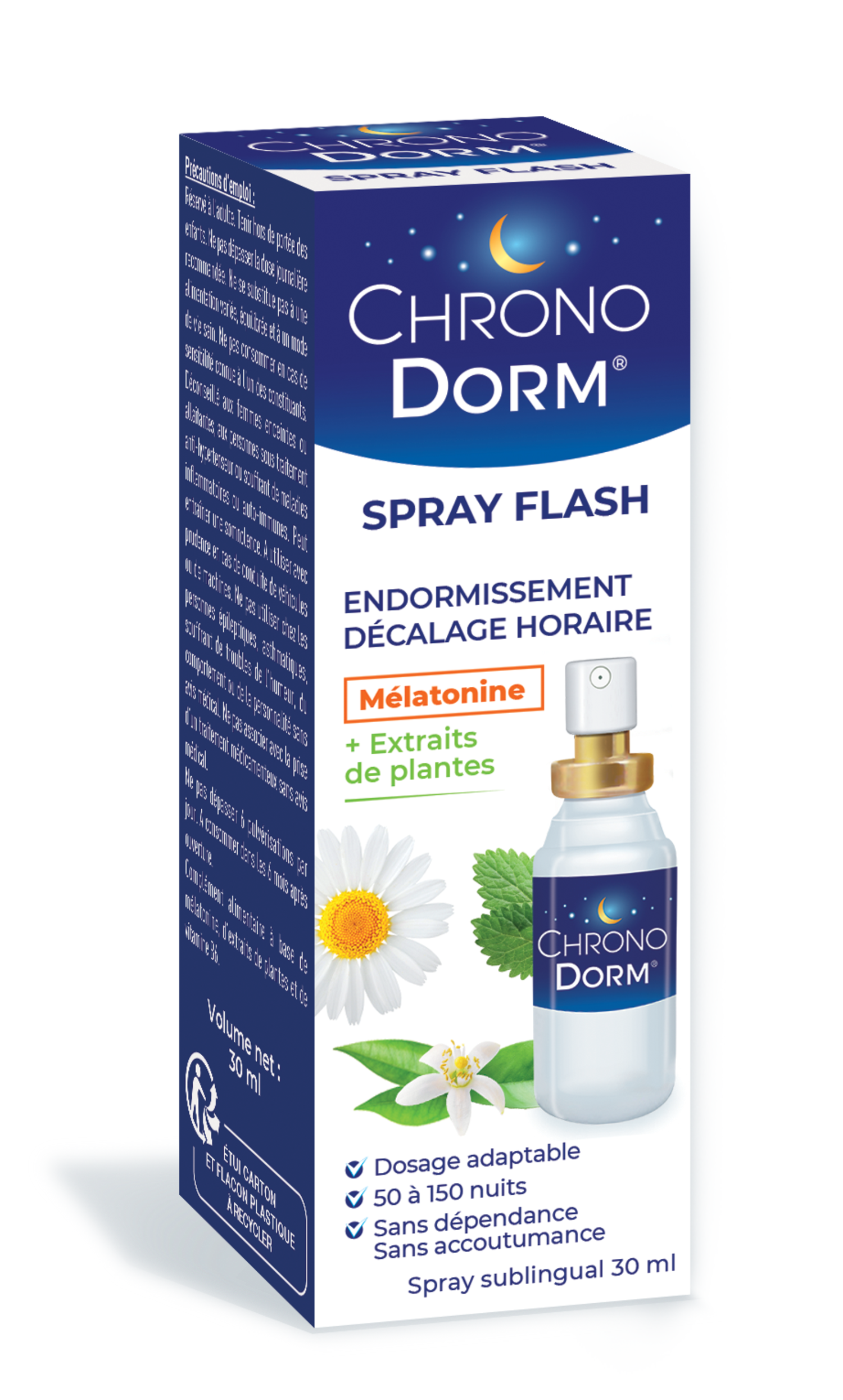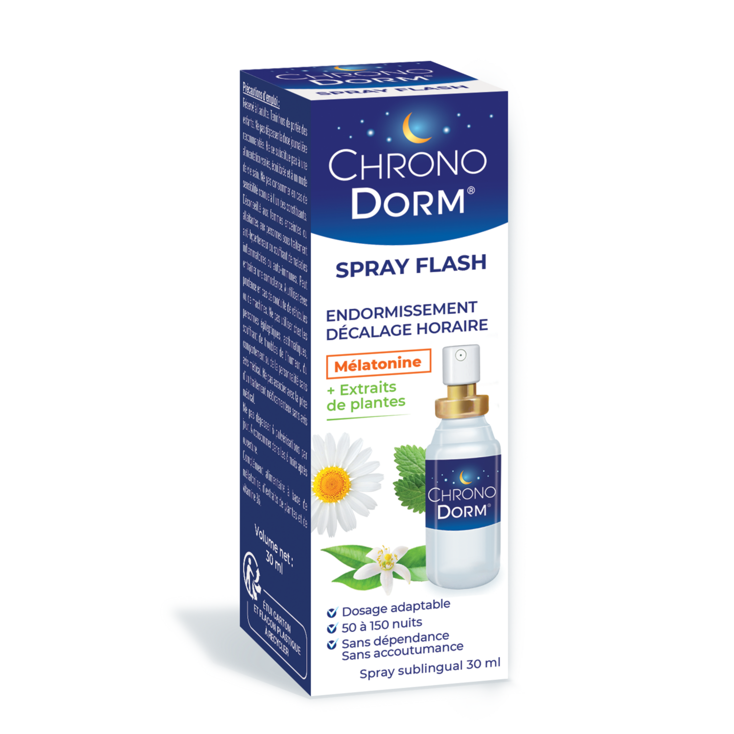 Chronodorm Flash s'utilise en pulvérisation sous la langue 30 minutes avant le coucher. Contribue à un endormissement plus rapide grâce à la mélatonine : 4 à 6 pulvérisations Contribue à atténuer les effets du décalage horaire grâce à la mélatonine : 2 pulvérisations la veille du départ puis 2 pulvérisations le jour de l'arrivée et les quelques jours suivants
