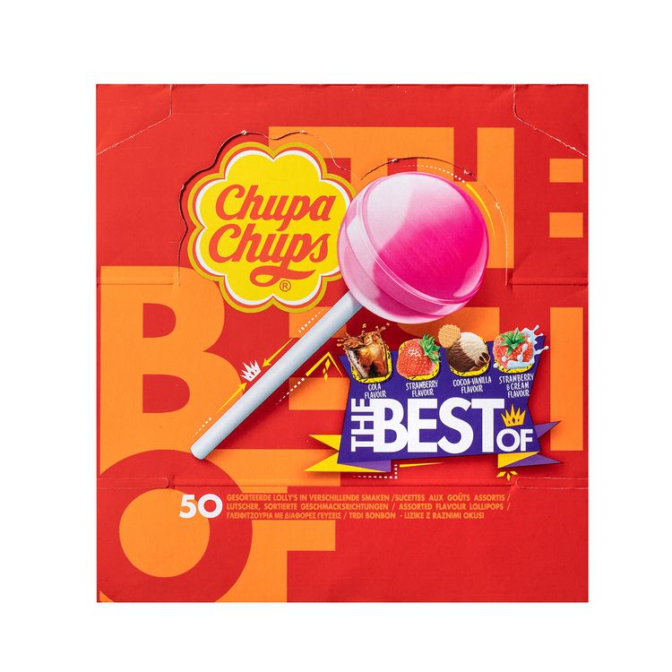 Les célèbres sucettes Chupa Chups vous proposent de nombreux parfums pour régaler petits et grands à tout instant ! Chupa Chups Best of l'assortiment des meilleurs parfums de la gamme Chupa Chups dans un seul carton. Parfums : Fraise, Cola, Lait-Fraise et Cacao-Vanille