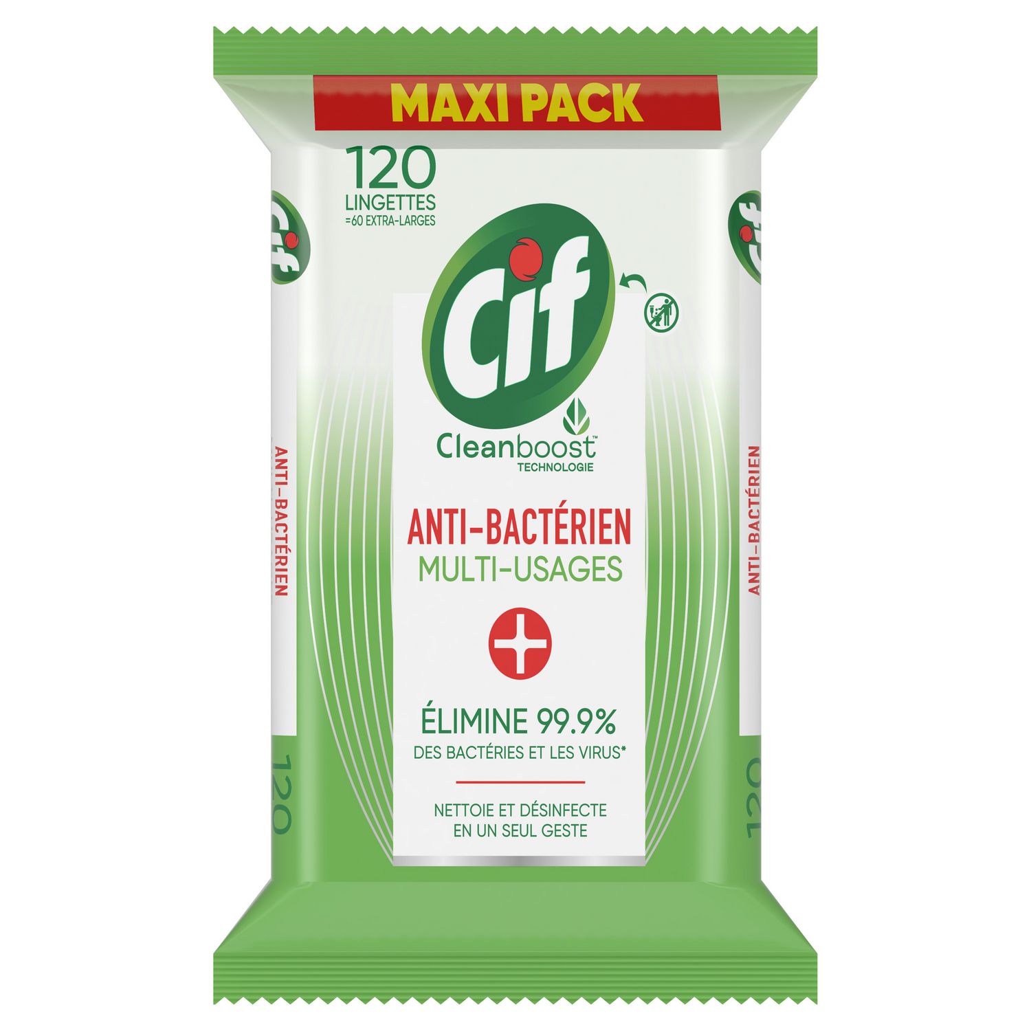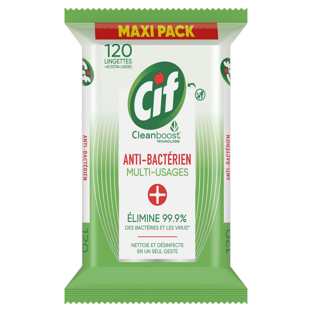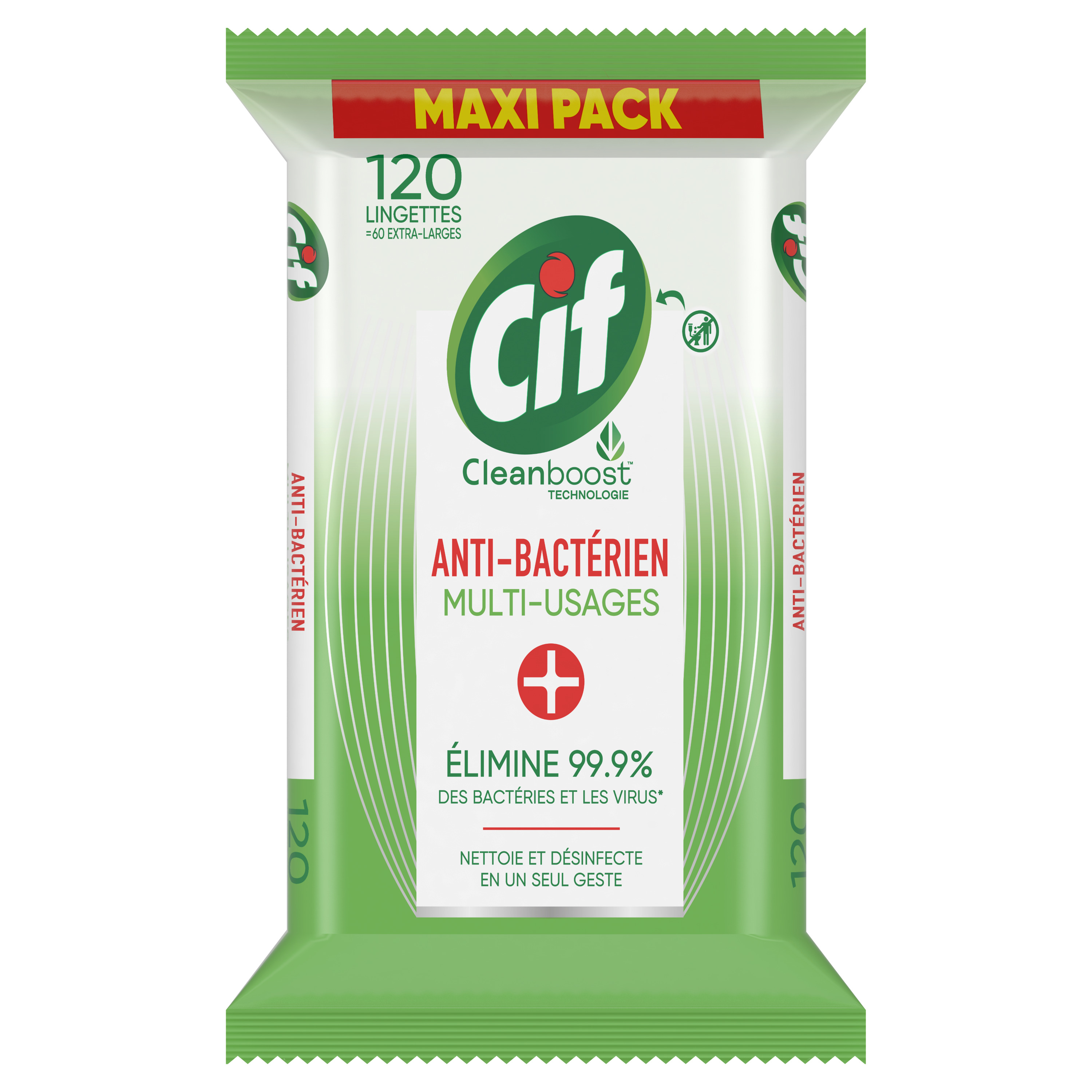 Les lingettes nettoyantes Cif Antibactérien Multi-Usages éliminent 99,9 % des bactéries connues et les virus *