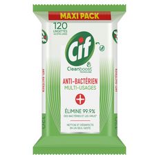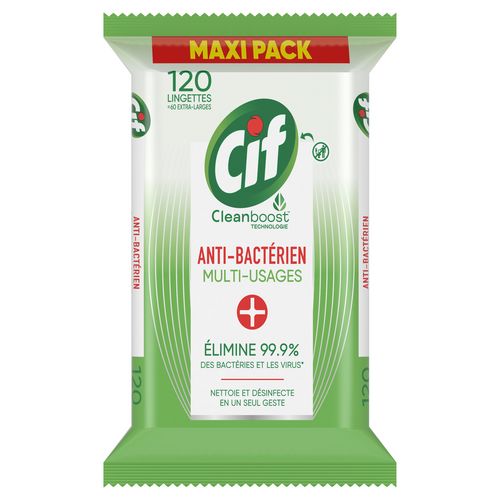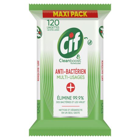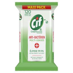 Les lingettes nettoyantes Cif Antibactériennes Multi-Usages bénéficient d'une technologie unique permettant un résultat impeccable et sans traces en un seul geste. Elles éliminent 99,9 % des bactéries et les virus.* Ces lingettes désinfectantes sont multi-usages et conviennent notamment pour les éviers, les lavabos, les plaques de cuisson, les baignoires et les douches, les réfrigérateurs, les poubelles, les tables ou encore les toilettes. Elles laissent une agréable odeur de frais dans toutes les pièces de la maison. Depuis 1965, Cif nettoie efficacement votre maison du sol au plafond tout en respectant vos surfaces. Aujourd'hui, grâce à sa gamme complète (sprays, éco-recharges, crèmes, lingettes, gel javel), Cif est votre allié pour une maison éclatante de propreté ! Au fil des années, la gamme Cif s'est enrichie pour répondre aux attentes de tous les consommateurs, en gardant pour ambition de proposer des produits ménagers efficaces (avec notamment une gamme axée sur la désinfection), pratiques à utiliser et respectant les surfaces : - Les pistolets vous assurent un nettoyage en profondeur pour un résultat éclatant et sans traces dans toutes vos pièces et sur tout type de surfaces (salle de bain, cuisine) - Les lingettes permettent un résultat impeccable et sans traces en un seul geste, tout en laissant une agréable odeur de frais dans toutes les pièces de la maison - Les crèmes Cif éliminent 100 % des taches grâce à leurs particules nettoyantes 100 % naturelles. Elles sont ultra-efficaces pour nettoyer les taches les plus incrustées sans rayer les surfaces - Le Gel Javel multi-usage Cif élimine les taches, dégraisse et nettoie hygiéniquement sols et surfaces *Élimine tout type de bactéries connues comme : Salmonelle, Staphylocoque Doré, E-coli, Listeria & élimine les virus enveloppés Influenza H1N1 et Vaccinia virus (selon EN14476).