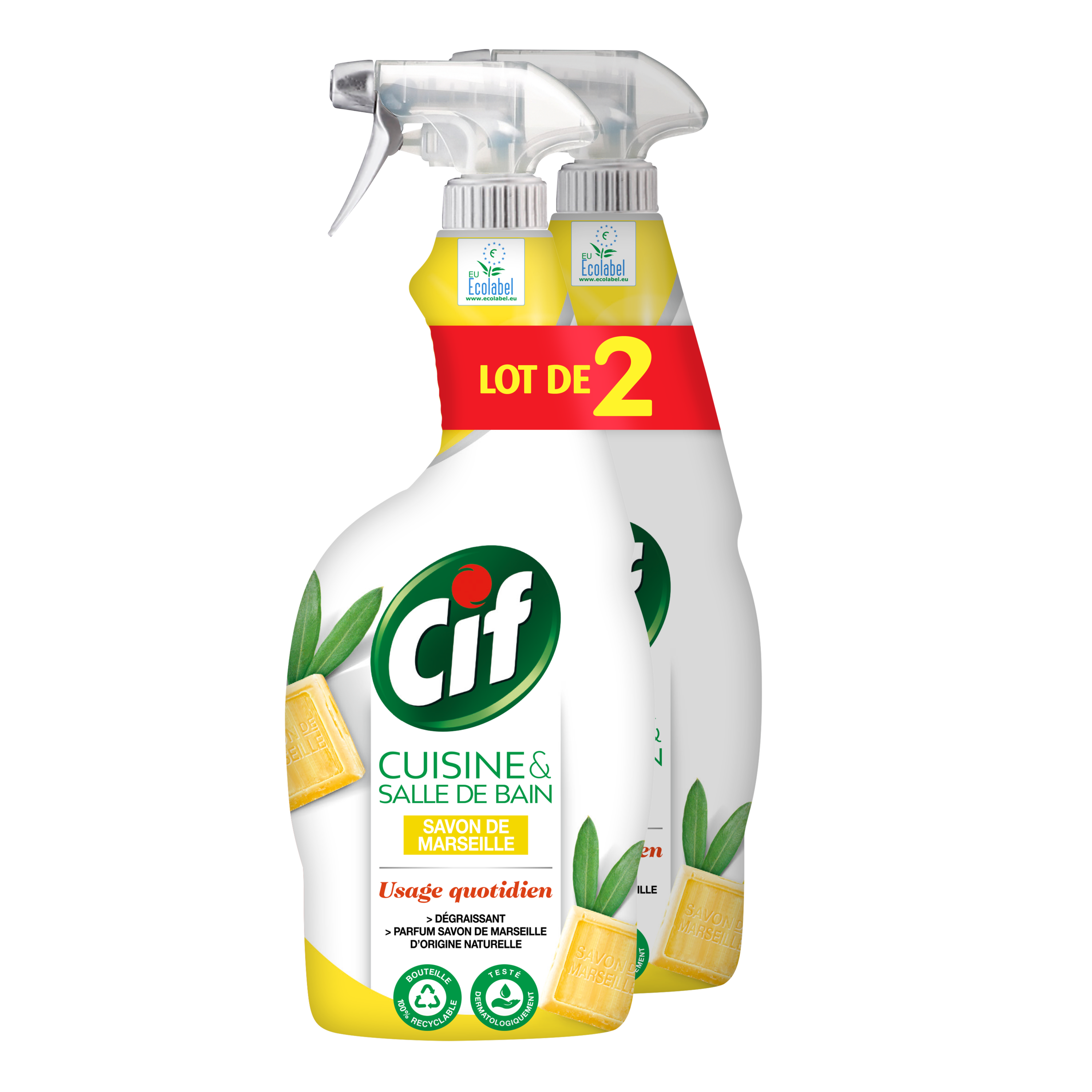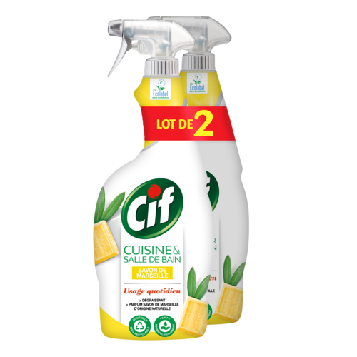 ATOMISEUR NETTOYANT Le spray nettoyant Cif Ecolabel Cuisine & Salle de Bain au parfum Savon de Marseille d'origine naturelle est idéal pour le nettoyage au quotidien grâce à ses propriétés dégraissantes. Sa formule testée dermatologiquement respecte vos surfaces et votre entourage. Réduisez l'impact de votre consommation sur l'environnement en recyclant cette bouteille dans le bac jaune. Depuis 1965, Cif nettoie efficacement votre maison du sol au plafond tout en respectant vos surfaces. Aujourd’hui, grâce à sa gamme complète (sprays, lingettes, crèmes, gel javel), Cif est votre allié pour une maison éclatante de propreté ! Au fil des années, la gamme Cif s’est enrichie pour répondre aux attentes de tous les consommateurs, en gardant pour ambition de proposer des produits ménagers efficaces, pratiques à utiliser et respectant les surfaces : - Les pistolets vous assurent un nettoyage en profondeur pour un résultat éclatant et sans traces dans toutes vos pièces et sur tout type de surfaces (salle de bain, cuisine) - Les lingettes permettent un résultat impeccable et sans traces en un seul geste, tout en laissant une agréable odeur de frais dans toutes les pièces de la maison - Les crèmes Cif éliminent 100 % des taches grâce à leurs micro-particules. Elles sont ultra-efficaces pour nettoyer les taches les plus incrustées sans rayer les surfaces - Le Gel Javel multi-usage Cif élimine les taches et nettoie hygiéniquement sols et surfaces (dégraisse, fait briller).