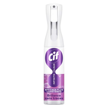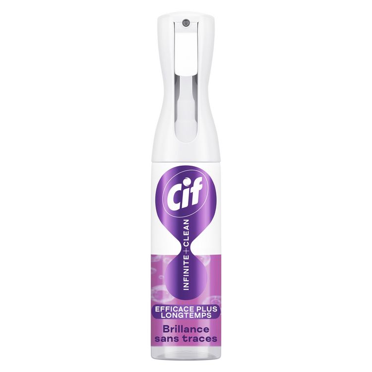 Simplifiez votre routine de nettoyage avec le pistolet spray Cif Infinite+Clean. Sa formule tout en 1 unique multi-usages et multi-surfaces offre un nettoyage sans efforts. Ce produit nettoyant est spécialement conçu pour un nettoyage longue durée de toutes les surfaces. Sa technologie unique aux probiotiques naturels continue à agir pendant 7 jours. Vous pouvez également utiliser Cif Infinite+Clean pour rafraîchir vos textiles. Vivez une expérience complète grâce à ce pistolet multi-usages et multi-surfaces : cuisine (plaques de cuisson, hotte, évier, micro-ondes), salle de bain (baignoire, miroir, toilettes), chambre (table de nuit, luminaires, étagères poussiéreuses), salon (table basse, meuble vitré, consoles de jeux ou téléphone portable), garage (vélo, raquette de tennis, carrelage, réfrigérateur) et bien d'autres… Nettoyez sans restriction toutes les surfaces de votre maison, même les plus fragiles comme le marbre ou les objets électroniques*. La formule Cif Infinite+Clean est adaptée et certifiée pour nettoyer en toute sécurité les surfaces alimentaires et l'environnement de la famille y compris celui des enfants et des animaux de compagnie (chat et chien). Expérimentez une toute nouvelle routine de ménage grâce à un pulvérisateur unique qui diffuse une brume fine déposant la quantité idéale sur les surfaces ou les textiles de la maison. Profitez d'un parfum unique frais pour une sensation de fraîcheur longue durée. Découvrez le système de recharge Infinite+Clean, Cif innove avec un format de recharge plus économique équivalent à plus de 2 fois la quantité du spray, vous permettant de réduire de 70%** la quantité de plastique utilisée. À travers cette innovation, Cif s'engage vers un avenir plus durable. Notre nettoyant Brillance sans traces assure une propreté impeccable sans traces instantanément même sur les surfaces vitrées et sans rincer. Laissez ensuite les probiotiques naturels continuer à agir pendant 7 jours après que vous avez fini de nettoyer. Avec Cif Infinite+Clean, nettoyez moins souvent et profitez plus longtemps de votre propreté ! *Pour le matériel électronique, débrancher, vaporiser sur un chiffon et essuyer doucement. **Vs l'achat d'un spray.