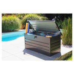 Ce coffre de rangement en acier galvanise? proposé par la marque DCB Garden permet de stocker en toute se?curite? les coussins et autres accessoires de jardin. Il est e?quipe? de ve?rins et d’un verrou. Il pourra ainsi se marier très facilement avec des ensembles d'extérieur proposés par la ga