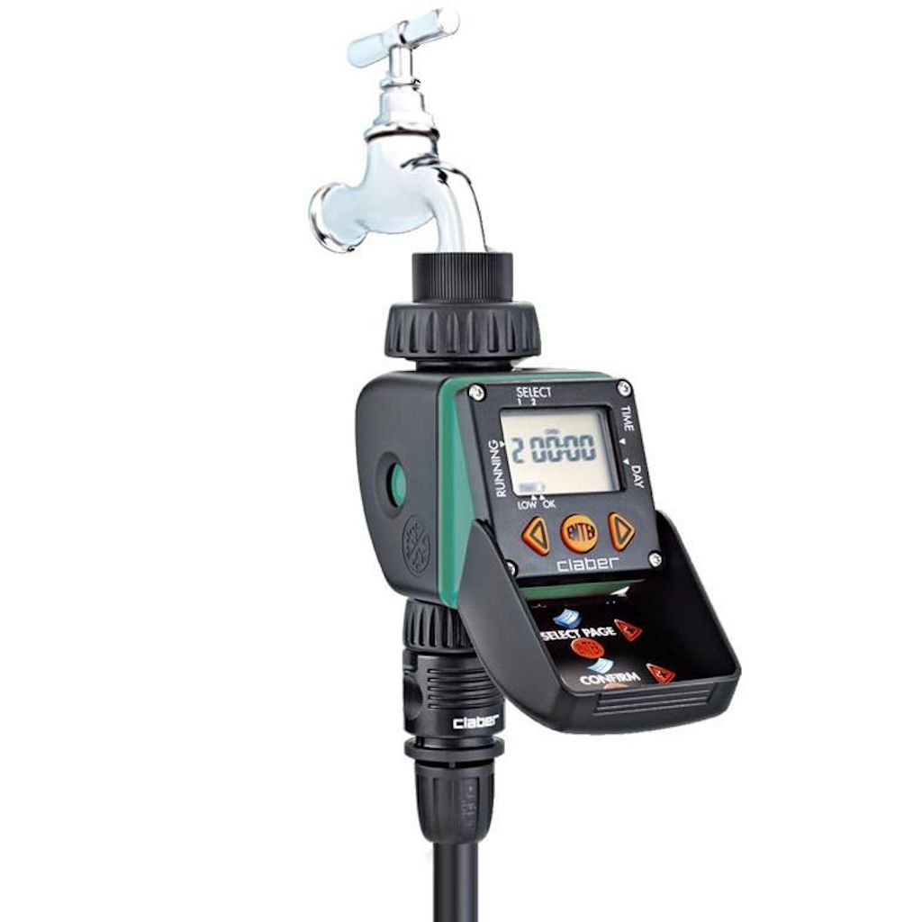 Claber 8428 Pour gérer avec précision et fiabilité jusqu'à 2 arrosages par jour, en programmant les temps et les fréquences avec trois touches seulement et en affichant toutes les fonctions sur un grand écran à cristaux liquides. La procédure de programmation est résumée au dos du couvercle de protection. Il est possible de sélectionner un temps d'arrosage d'une minute à 23 heures et 59 minutes et dexclure certains jours de la semaine. Fonctionne à batterie, n'a pas besoin de connexion électrique : il suffit de le visser au robinet. Son design compact permet de l'installer même dans des espaces réduits.